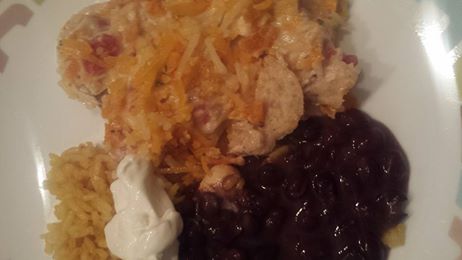 Place the crushed nacho tortilla chips on the bottom of a greased baking dish.