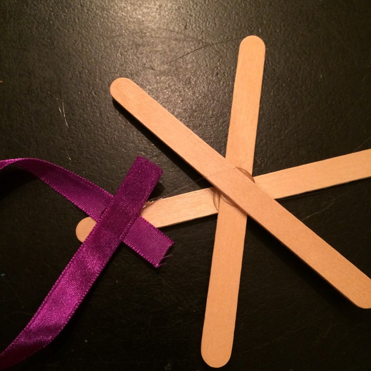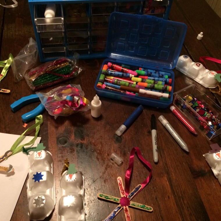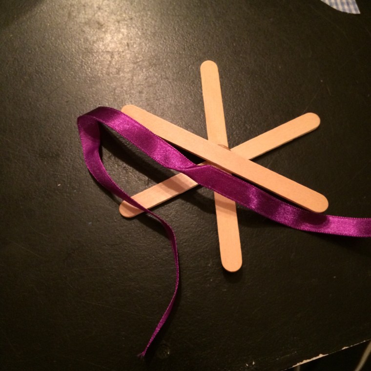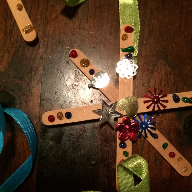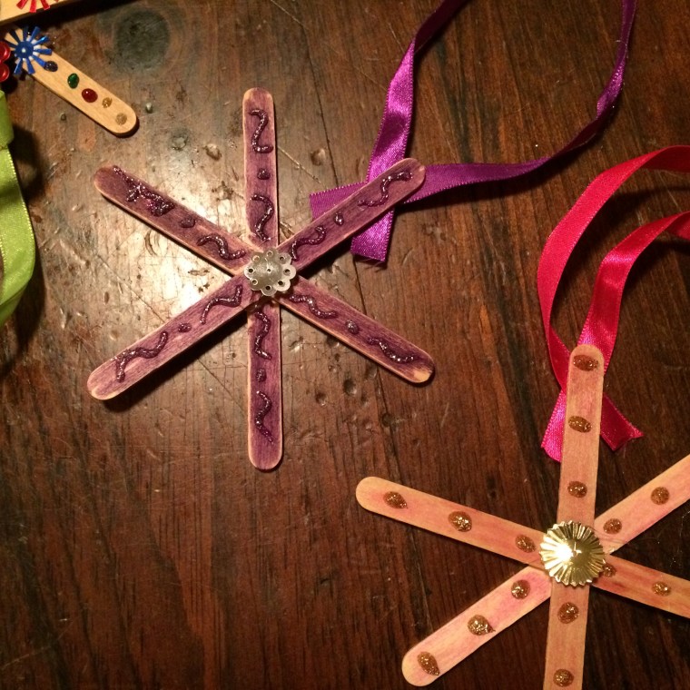 This is another easy craft for kids of all ages. Adults will need to use the hot glue gun to assemble the basic snowflake and to attach the ribbon but after that let the kids have use own imaginations.