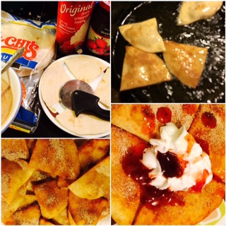My kids just love saying this, Sopapillas (Soap-ah-Pee-yas)! These are so easy to make and can be eaten plain, with the cinnamon and sugar mixture, or topped w/whipped cream and strawberry preserves.