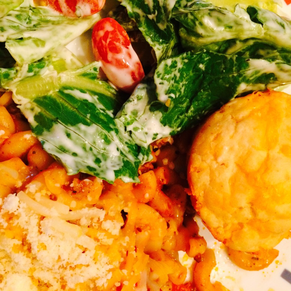Red & White Pasta, Salad, Cheesy Garlic Pull-apart Bread