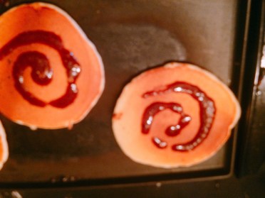 Heat your pan or griddle over medium-high heat and spray with cooking spray. Begin by making basic pancakes. When you flip them over then make a swirl on the tops with the filling. (I snipped a little too much and had a thick line, but no one complained.)