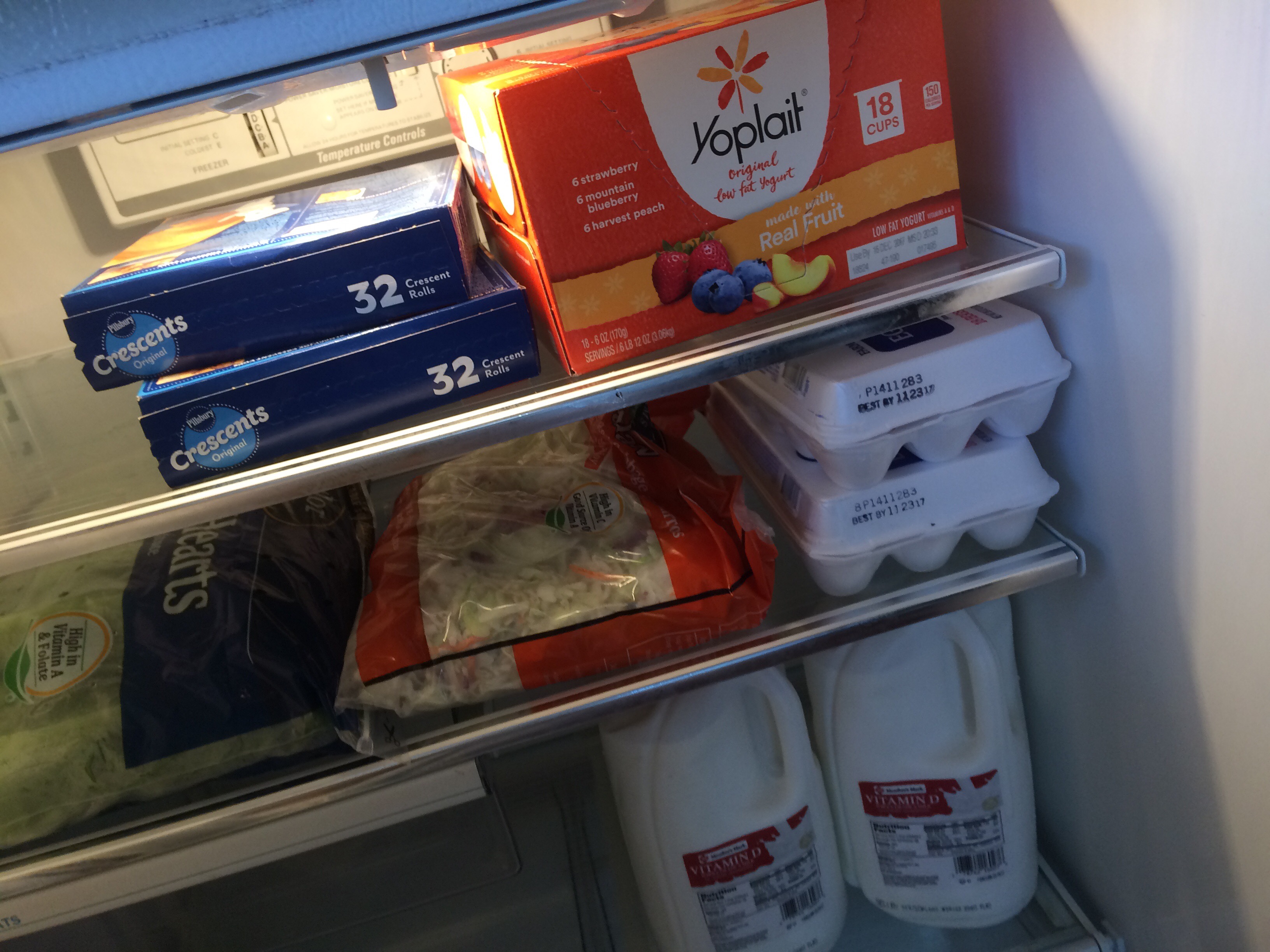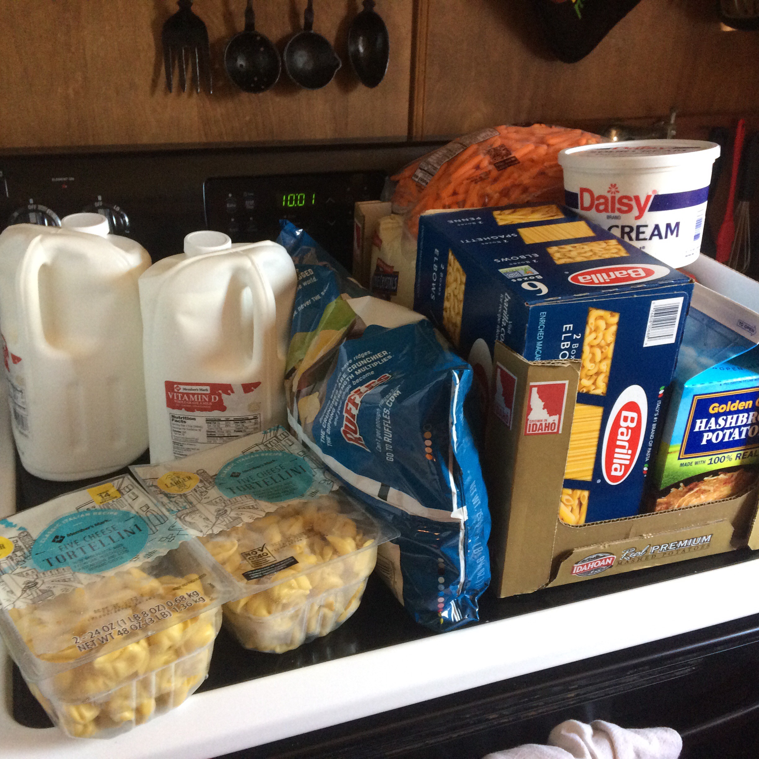 We got a variety of items this time around. Milk, eggs, yogurt, butter, sugar, chicken, pork chops, hamburger, potatoes, lettuce, carrots, tomatoes, apples, bananas, rice, pasta, household supplies, and various other things we use.
