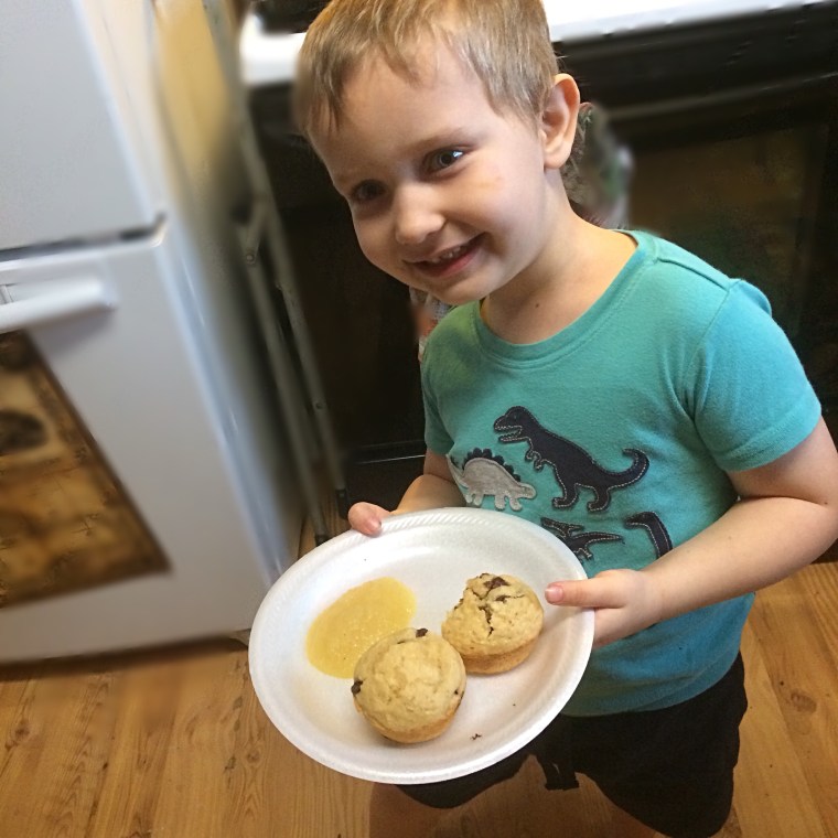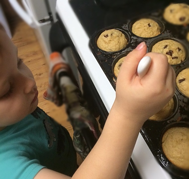 His idea was to make some Chocolate Chip Applesauce Muffins! I wasn’t sure but went along with it and we just kinda made it up as we went along. I’d ask his opinion and go with it. We’ve gotta let them experiment a little and keep the learning fun.