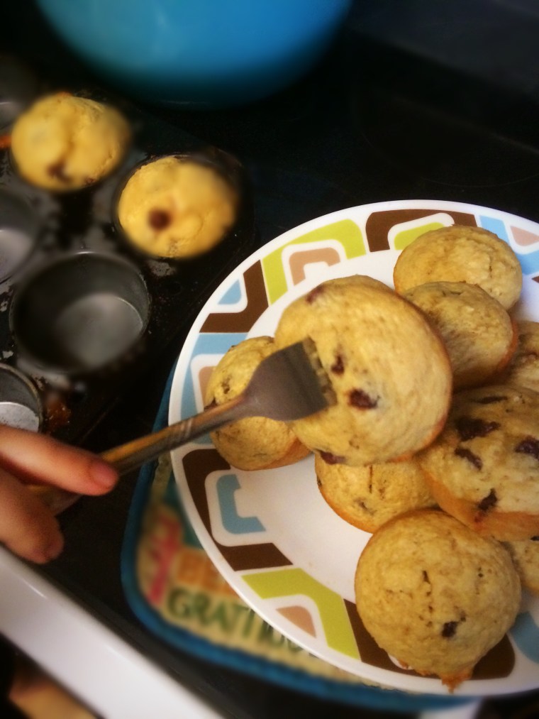 I really hadn’t the foggiest idea what kind of muffins to make. He opened the fridge and saw the applesauce and says ‘hmmmm’. Then he asked if we still had some chocolate chips from the fudge we made on Sunday. He announced that he had an idea.