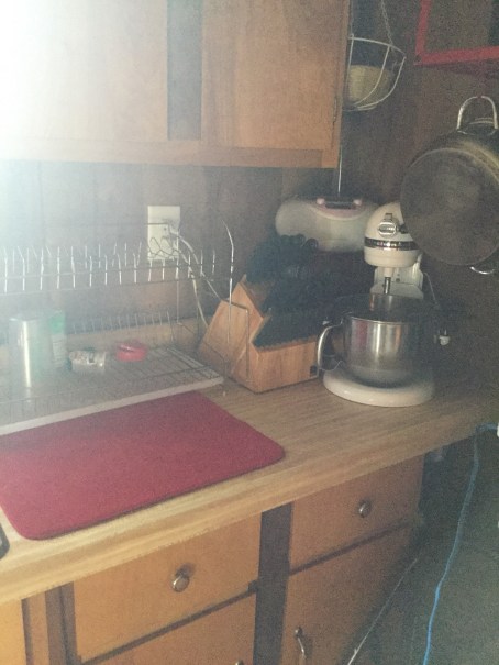 Now the counter top, which I didn’t get a before picture of, was cleared and wiped down. The kids used my little sponges to clean the dish rack and I used one to wipe down the mixer and the knife block. It’s crazy how dirty things can get. This is how it looks now.