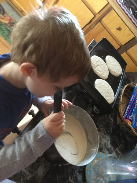 I wasn’t sure what he was doing but he had a sneaky little grin on his face. Then I realized that the next batch of pancakes had some chocolate swirls … he is definitely my little chef and loves helping in the kitchen.