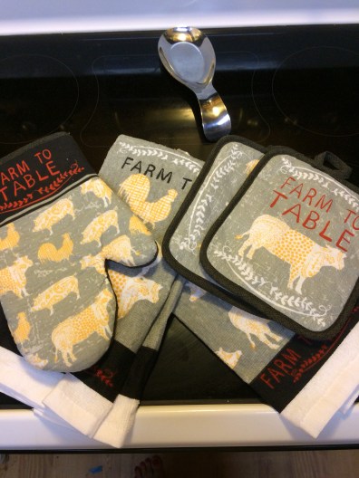 We picked up a couple of things for the kitchen while shopping. The kids helped me pick out some new potholders and a couple of kitchen towels. I also picked up a shelf for one of the cabinets. We tried to find a valance for the window with no luck. I think I have some fabric stuck in a drawer that might work.