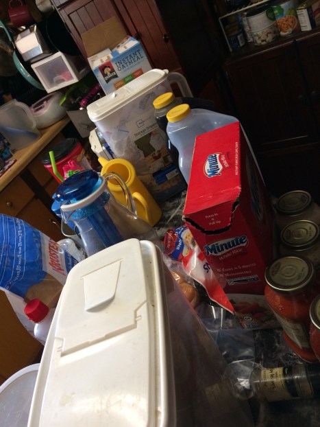I know the top shelf looks a bit cluttered. I try to keep the flour and cornmeal in containers but my containers are not very space saving at all. I also appear to have taken stock in the flour company. That yellow pitcher is for making funnel cakes and I jut haven’t figured out where else to put it yet.