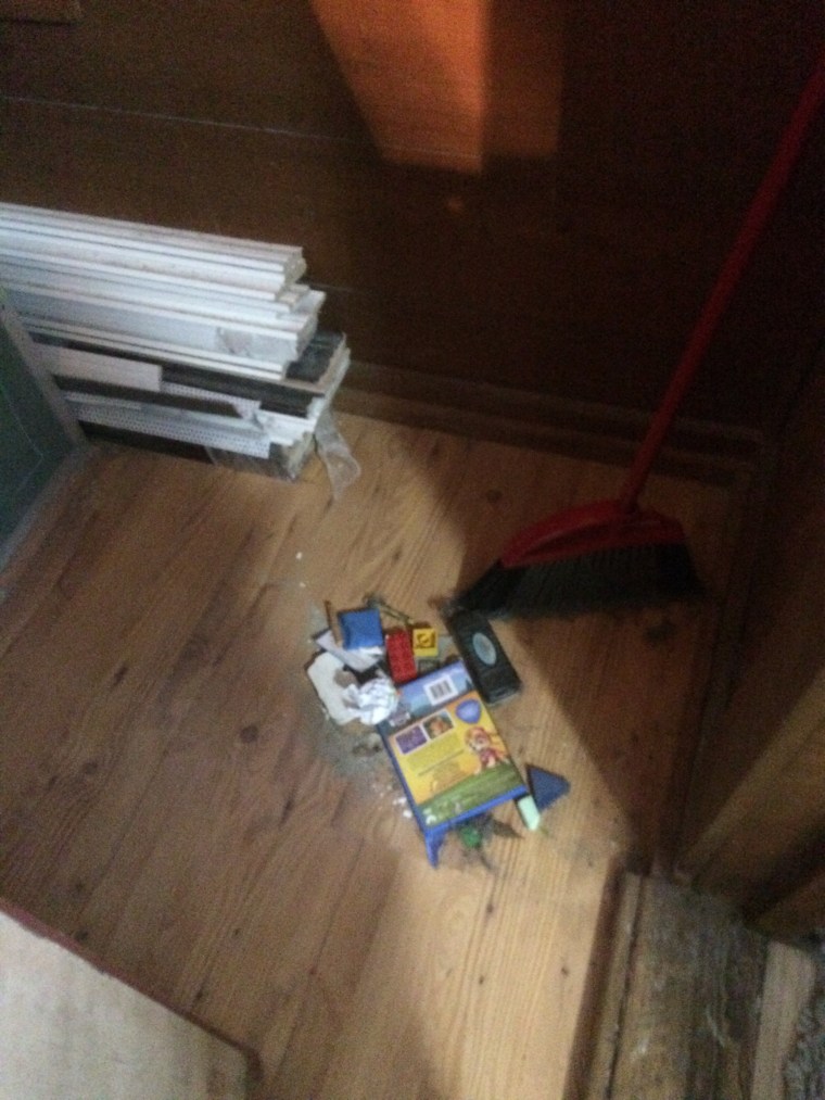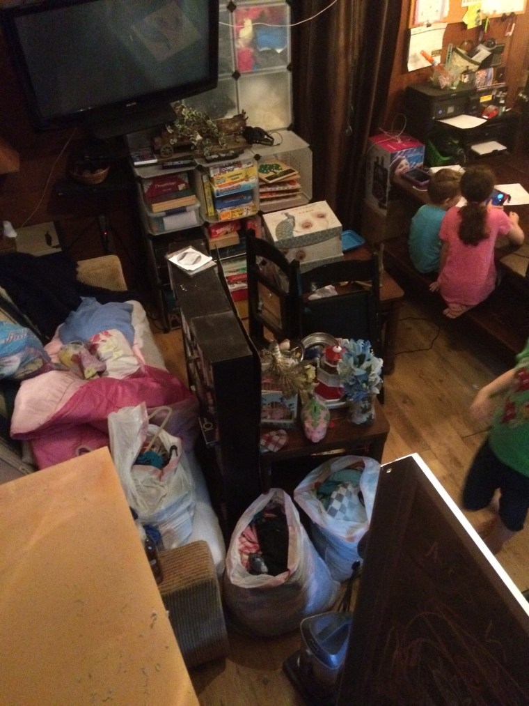 So that’s where all the missing puzzle pieces and bean bags have been hiding! That’s a stack of molding there too for a future project. We are hoping to get a storage shed cleaned out so we can move some of this molding and stuff out of the house.