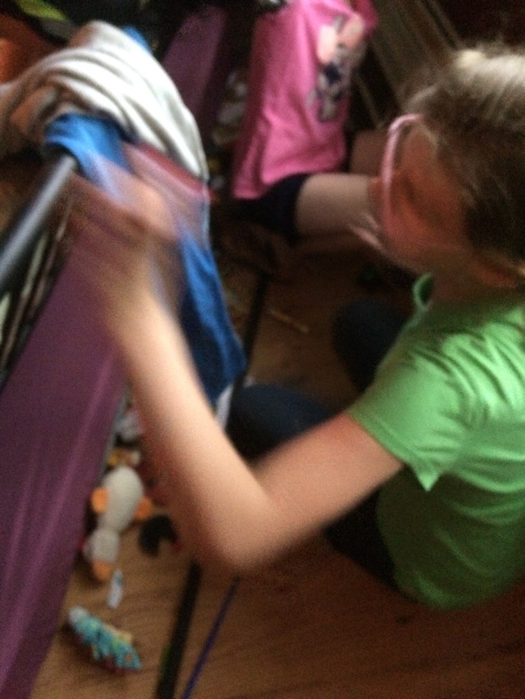 The girls made their beds with the freshly laundered sheets and wiped down the bunk bed and chalkboard while I cleaned. I would have had them help with the wall but I have gotten a couple of nasty splinters already so I let them handle some of the other cleaning. Then we did a quick mop.