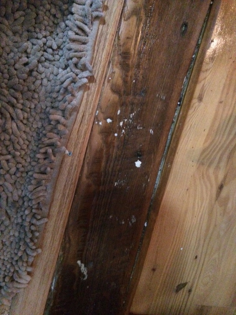 Then I set to work scrubbing that dirty threshold between the main room and the bedroom. I ended up using a stiff bristle brush and the wood cleaner to get it clean. I also had to take off the front piece of trim to get all of the dirt out. (Oops, I should’ve shook out the rug before the pic.) The difference is amazing and I am wondering how the walls would’ve looked if I’d been using that brush to start with. I think I’m gonna need to invest in a long handled brush and a sturdy bucket for this task in the future.
