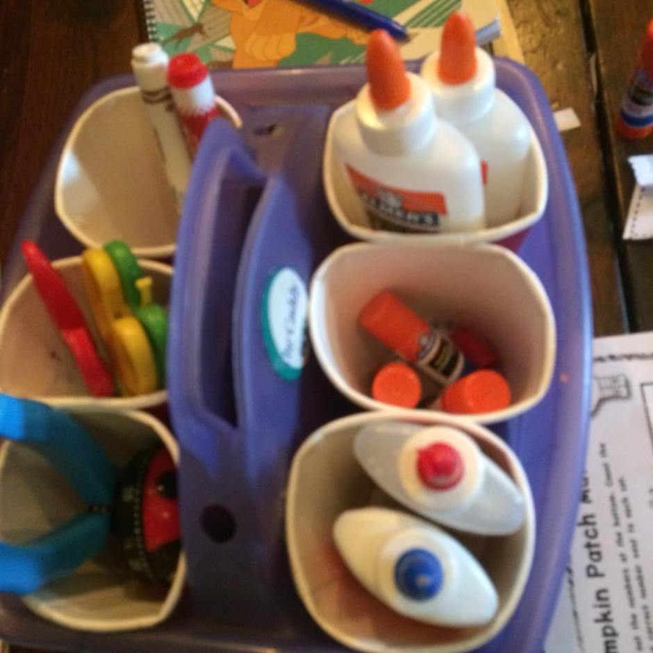 You can have a designated spot for the kid’s to put their completed work for you to check. For a long time did use a file sorter with their name’s on it… it was color coded too which helped a lot. Color coding works well if you have multiple children as you can assign a different color/pattern to each child. If you give Child 1 blue and then Child 2 green you will automatically know who left their basket out when you see the green basket on the table.