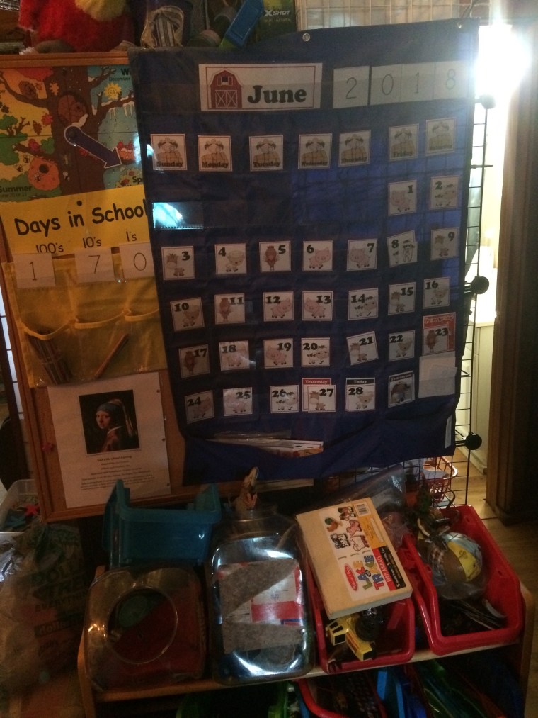 I do have some fabric and patterns in a rolling cart that is in my room. I also have my sewing boxes under the bed. Maybe one day we will have a dedicated sewing area.For now I’ll be happy with the progress we’ve made. I still need to come up with some more ideas as we have supplies and activities for next year arriving on a daily basis.