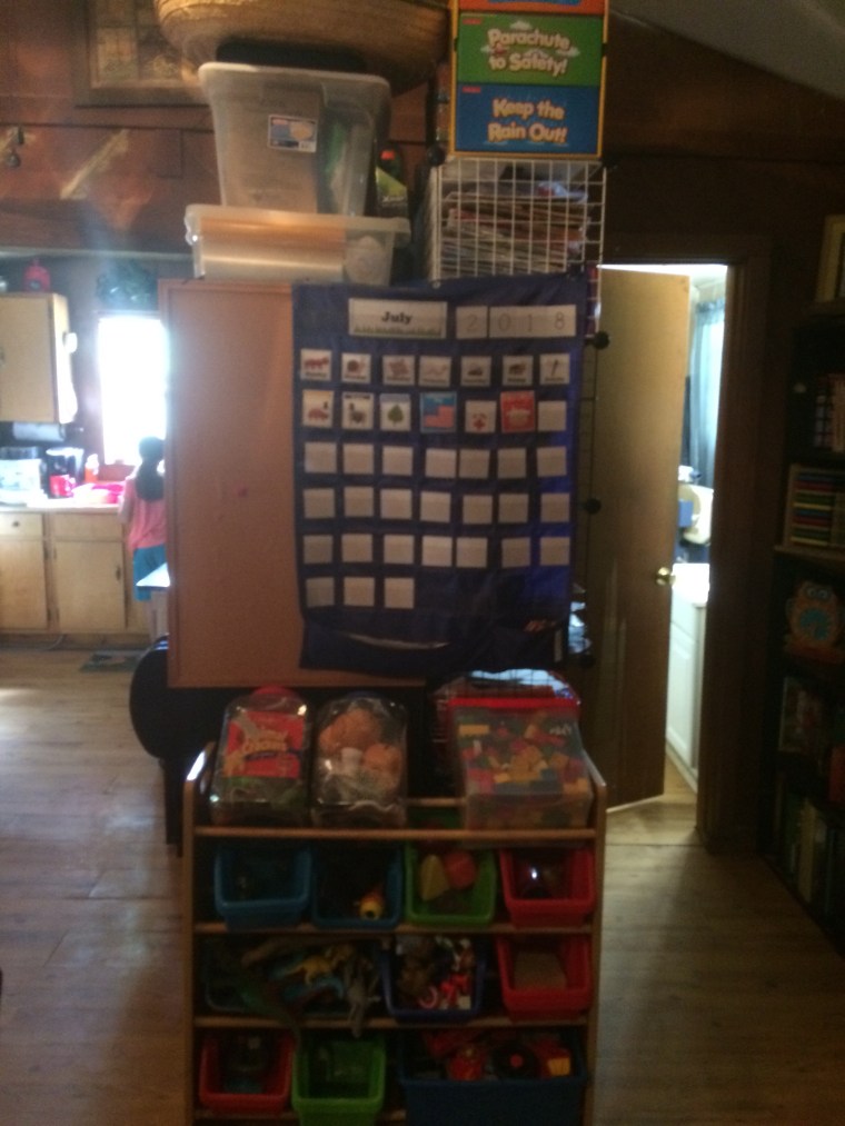 Here is the view of our calendar wall and toy shelf. I do have some pretty neat ideas for some projects here. I also have some more things coming to go in this area.