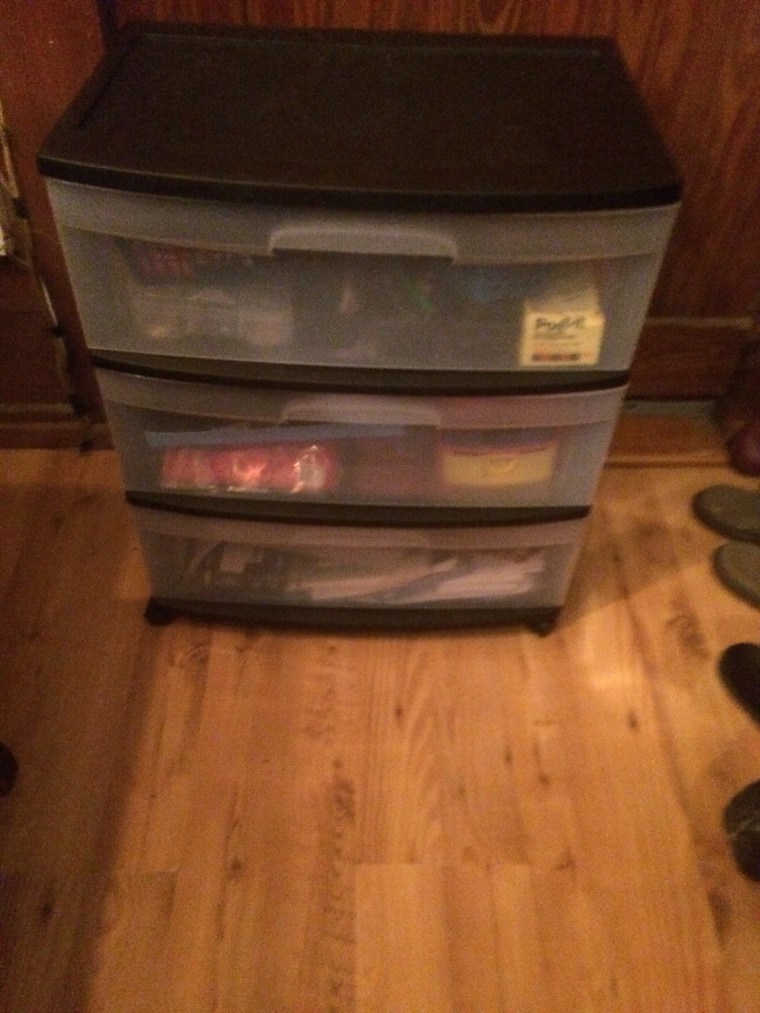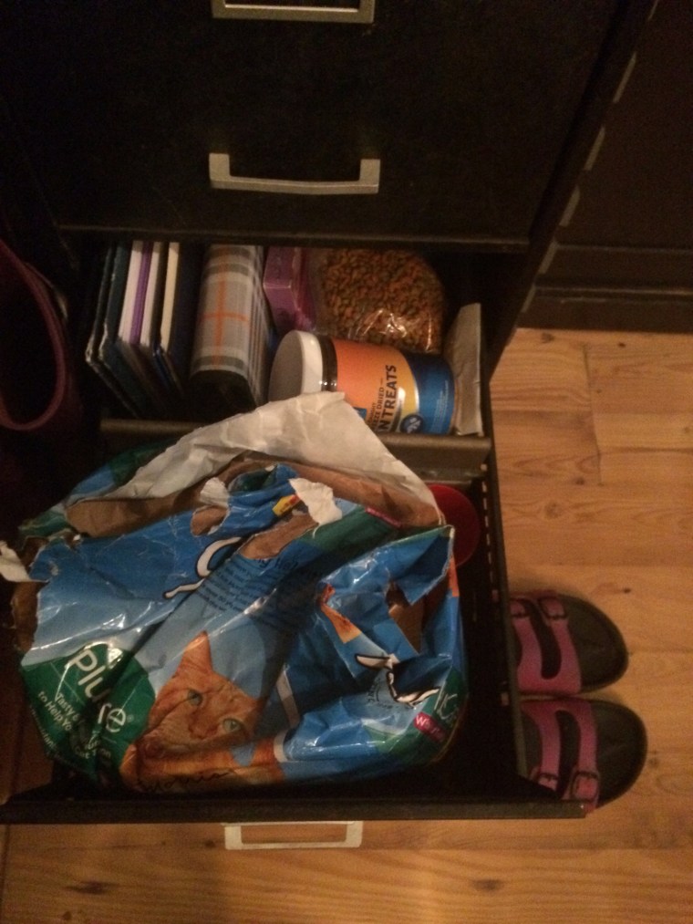 This drawer is Jacob’s favorite (and the cat’s). It holds the cat food and treats. I do have a couple of binders with papers in here too.The top drawer has miscellaneous household stuff like door knobs, shims, outdoor light, etc for projects that need completed.Hmmmm… let me think if there was anything else we worked on.Well I did add labels to a lot of the bins and shelves. I’ve also ordered a couple of items to put in place soon.Oh, I remember… I still needed an office space as my desk now holds the Spielgaben stuff.