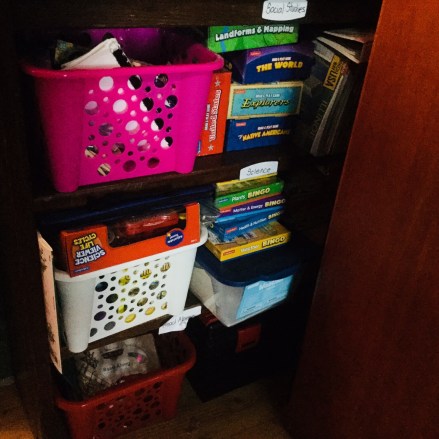 In addition to this we have a cabinet with art supplies, another cabinet with other supplies, a tech cabinet to store and charge our laptops and tablets, plus several other cubbies that hold additional resources. I took a little time earlier this summer to get it all organized and weeded through.