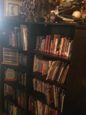 Our main area is our dining table. We have some bookshelves which hold the majority of our books plus I have another shelf with the books I am using that are specific to our curriculum for this year.