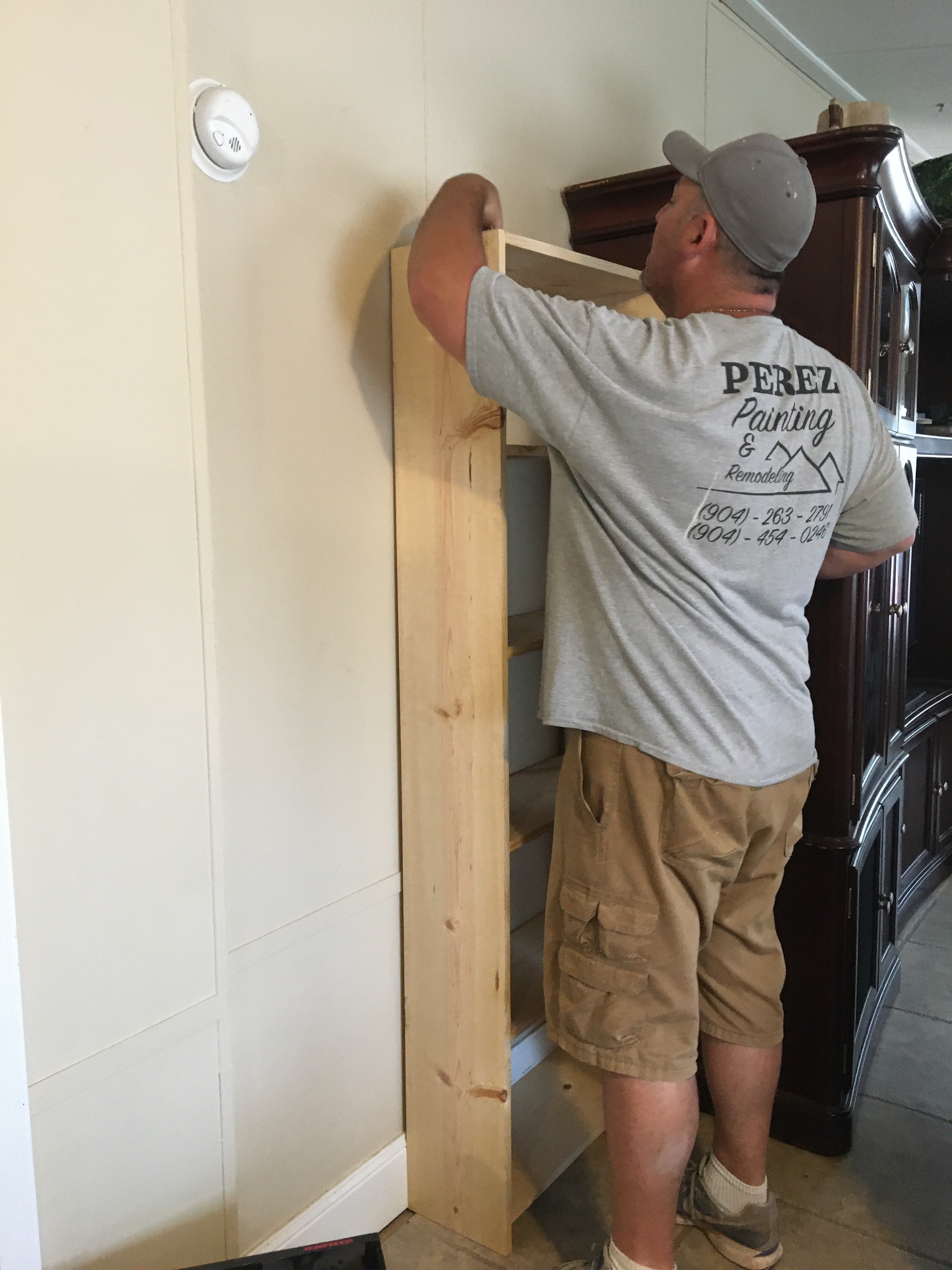 The shelves were set in place and we used ‘L’ brackets at the tops to prevent them from tip overs.