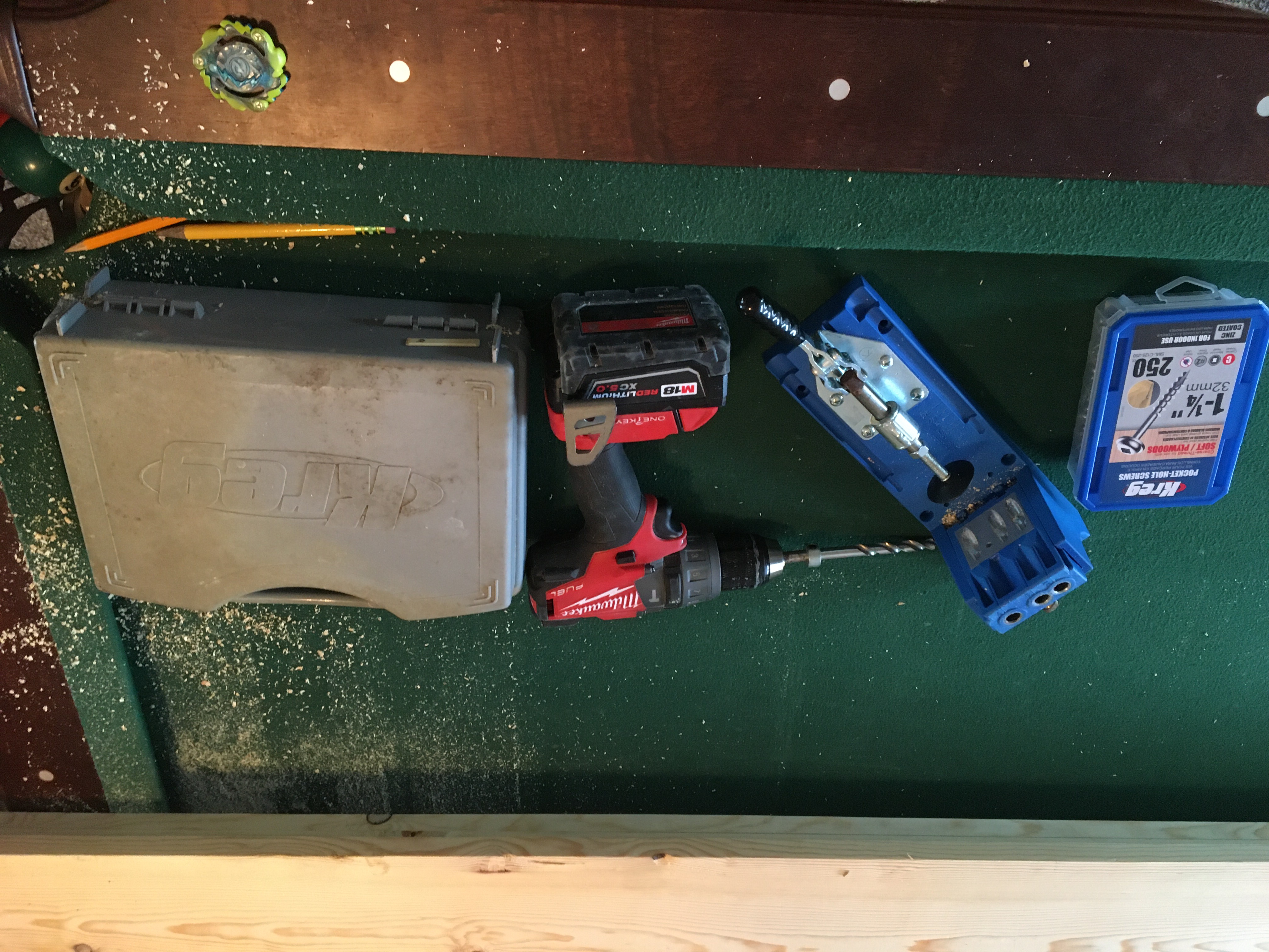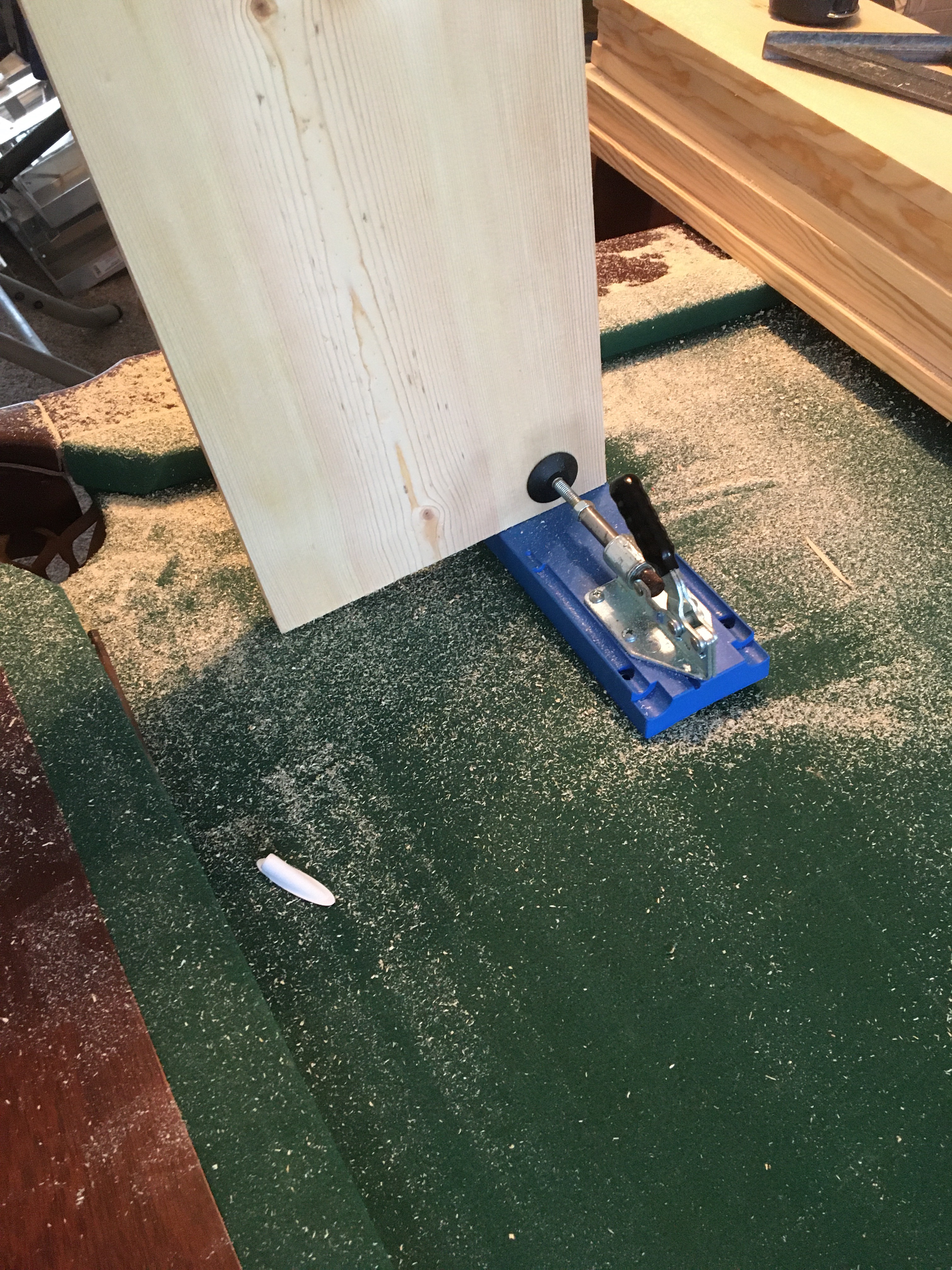 The shelves, tops, and bottoms were then put into the jig to make pocket holes for the screws.