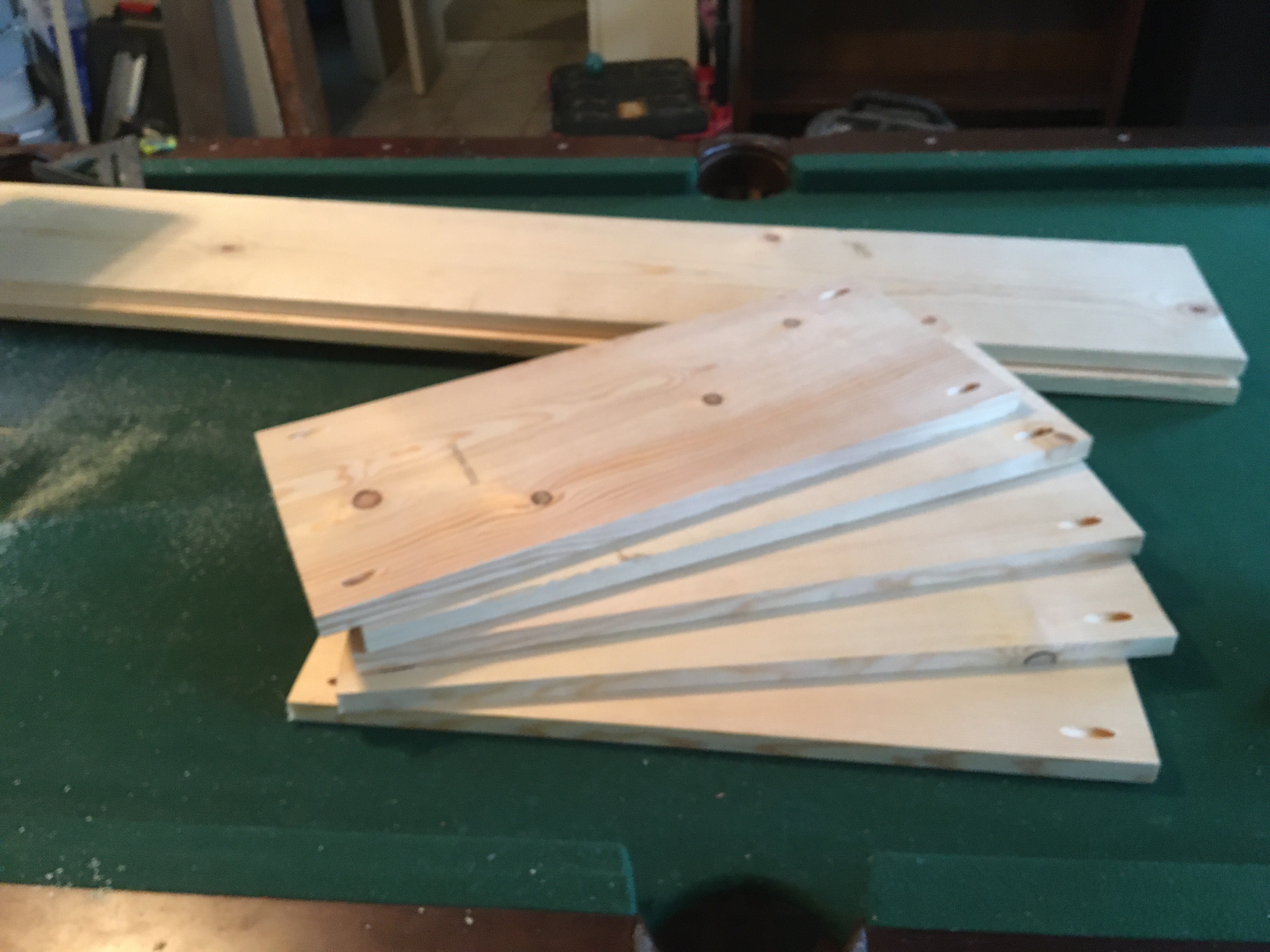 The other two boards were cut into eight pieces that measured 22.5 inches. These would be the shelves.