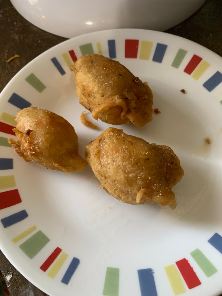 The recipe below is a combination of my sourdough batter that I use on many items (including fried squash) and the cheese filling we use for bacon wrapped peppers… these were pretty darn good. A lot of the recipes I saw online seem to use goat cheese but I didn’t have any so I just threw together what we had on hand.