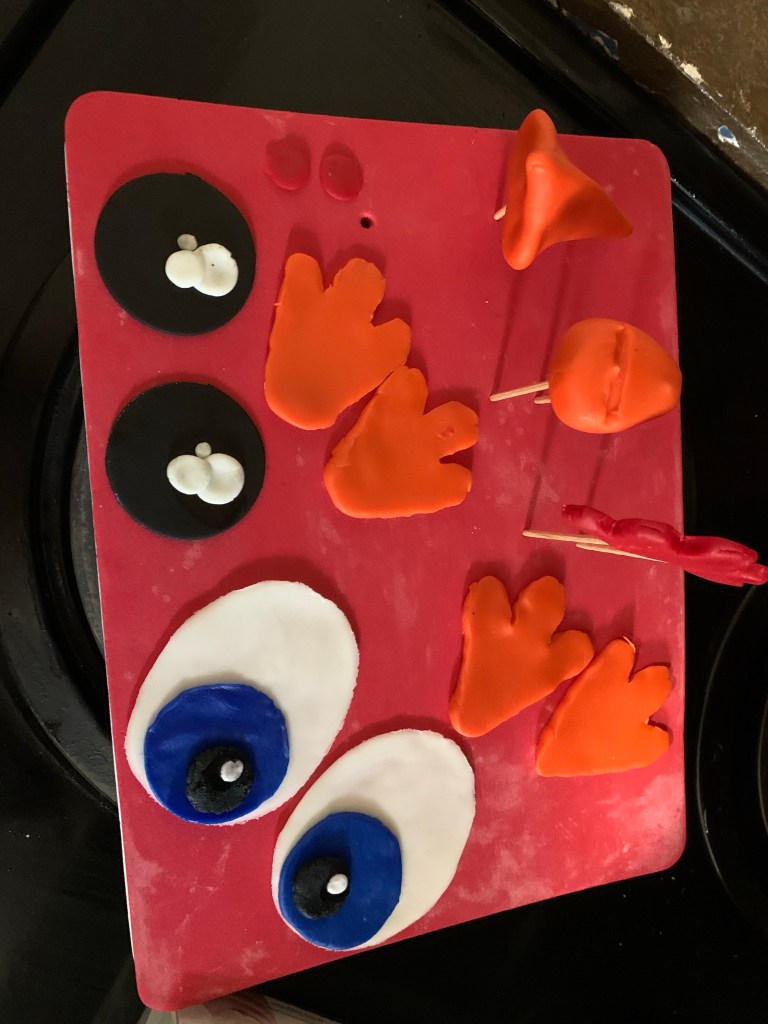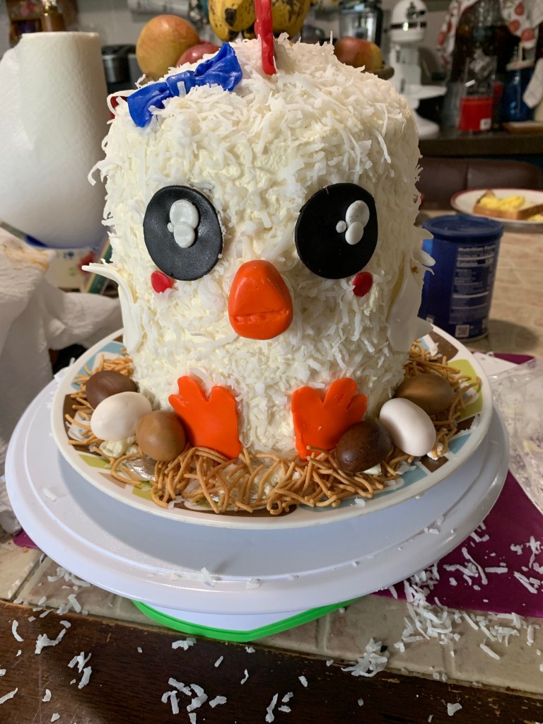 I then added some chow menu noodles for the ‘nest’ and made some fondant ‘eggs’ to complete it.