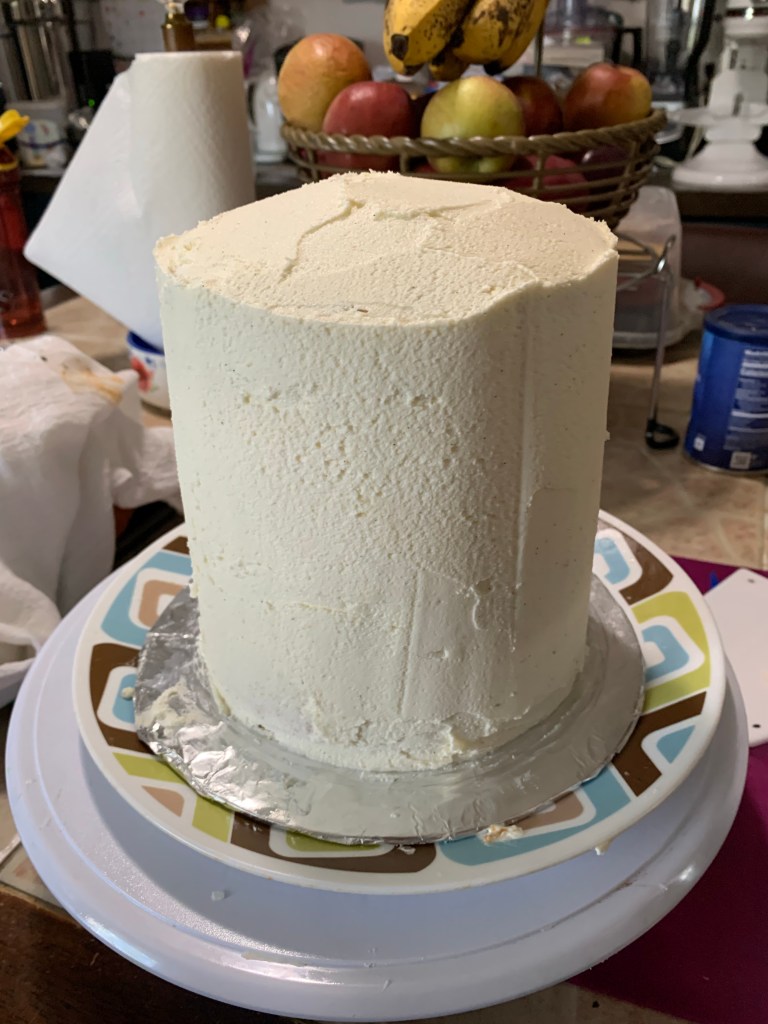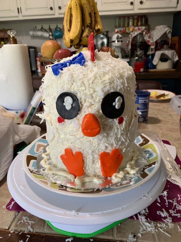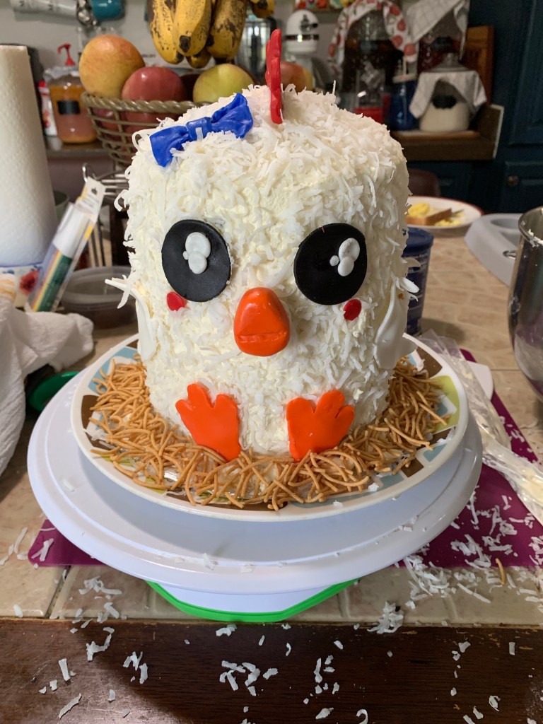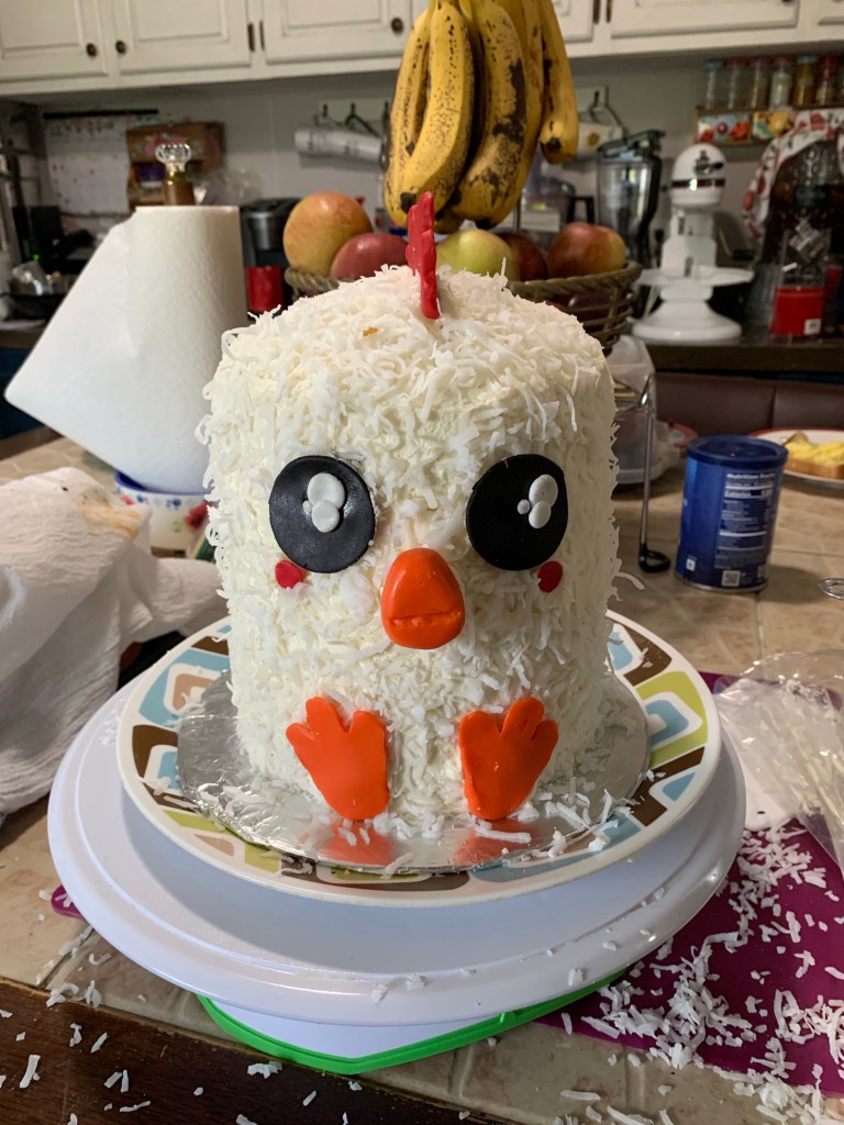 The white chicken was made with 4-six inch cake layers. I used some straws to stabilize the layers. I did a crumb coat and set it in the fridge for 30 minutes while I made the fondant accents for the cakes. The six inch cake pans have been my favorite size here lately! You can see more cakes made with these pans in this post HERE.