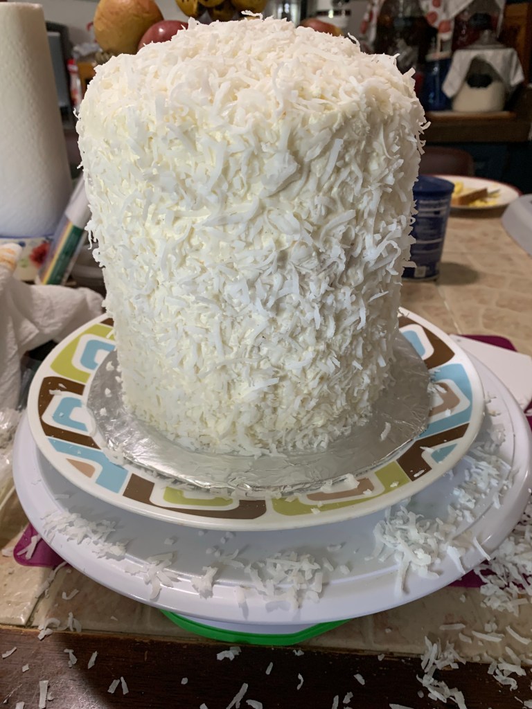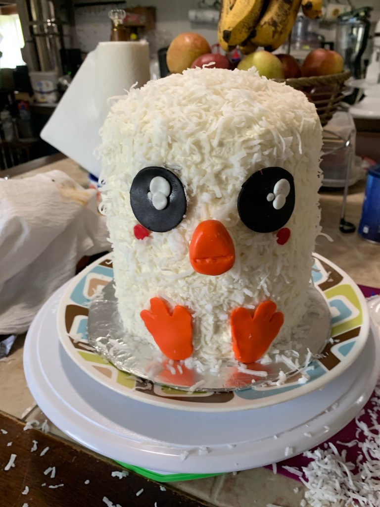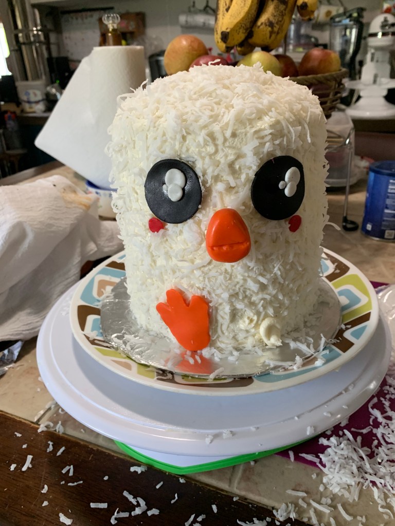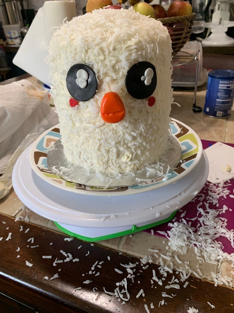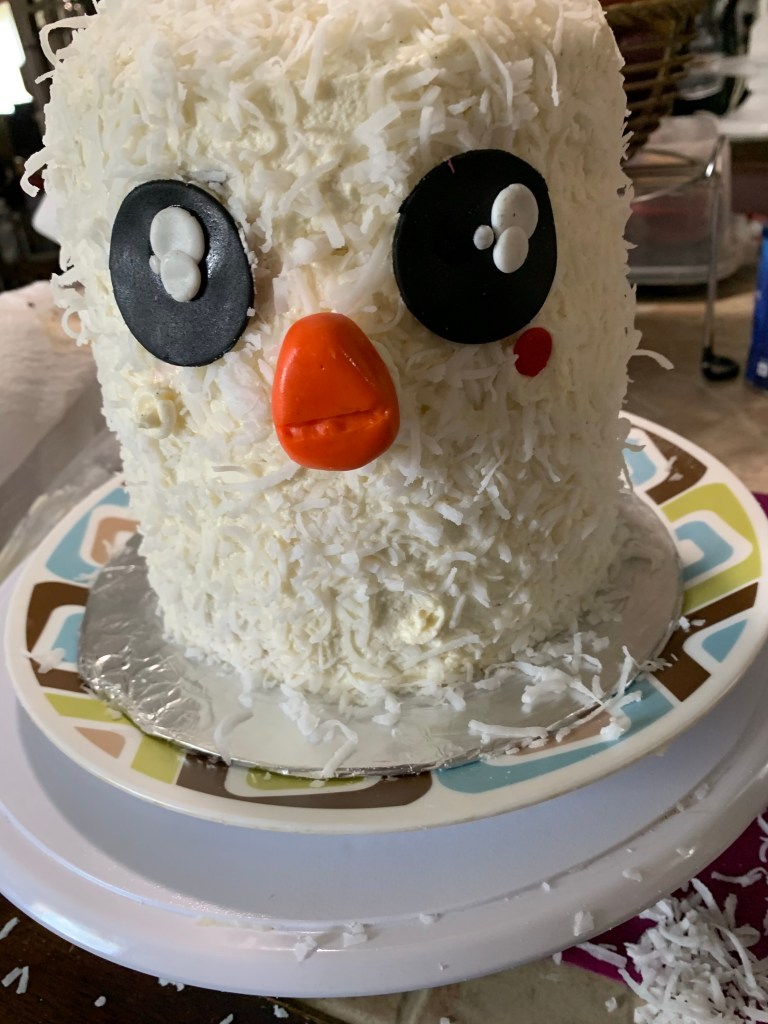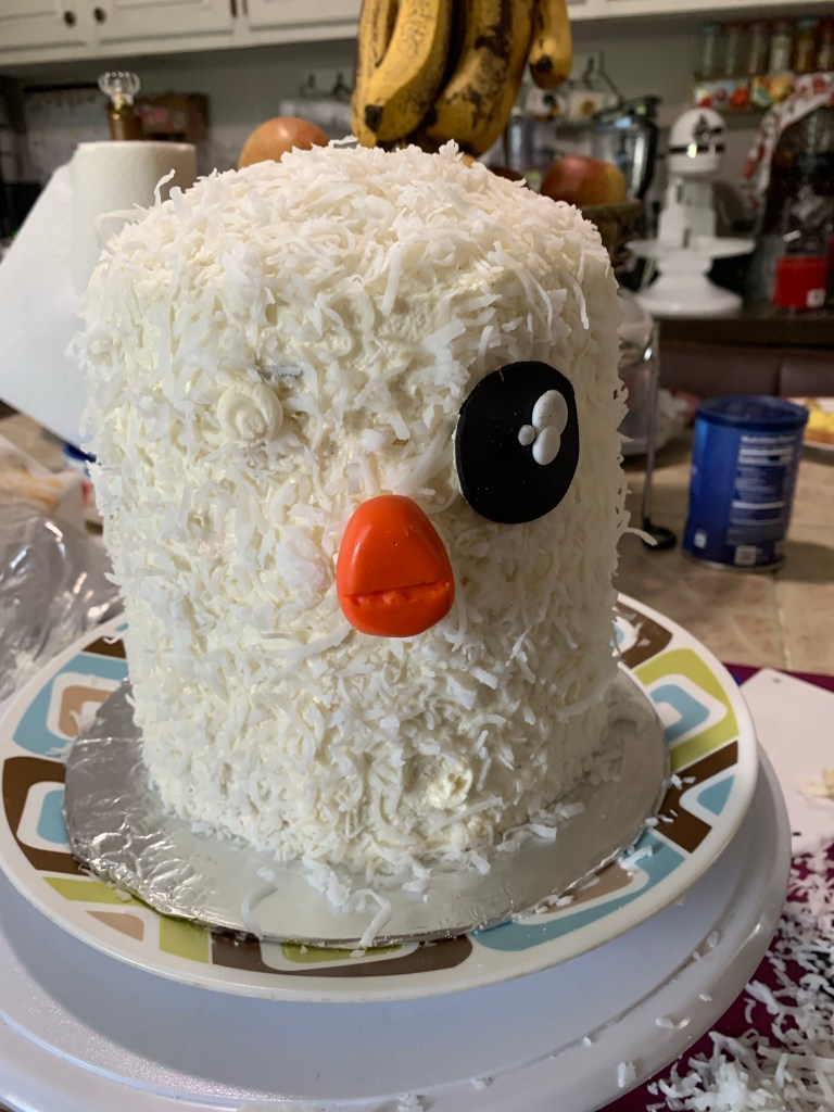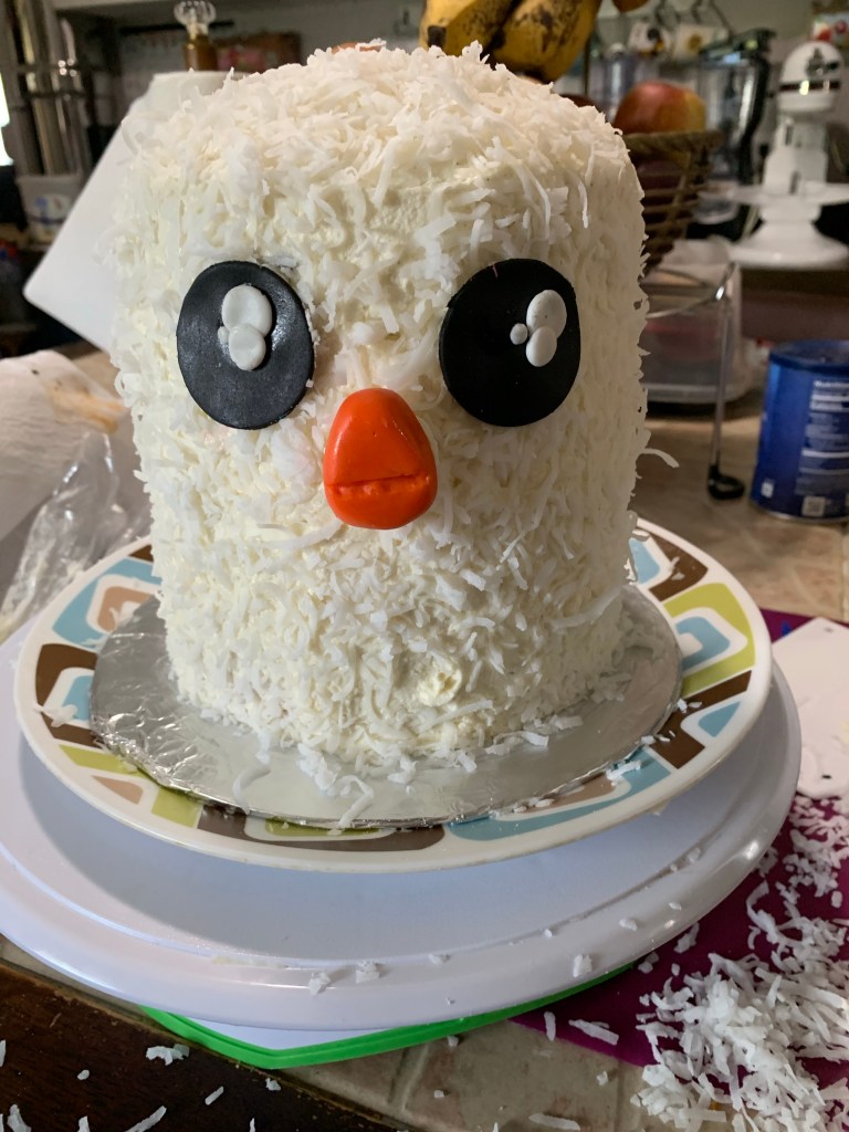 I frosted it with some coconut flavored buttercream icing and then added the coconut to the sides. I used a little bit of buttercream to attach the fondant pieces… even the ones that had toothpicks.