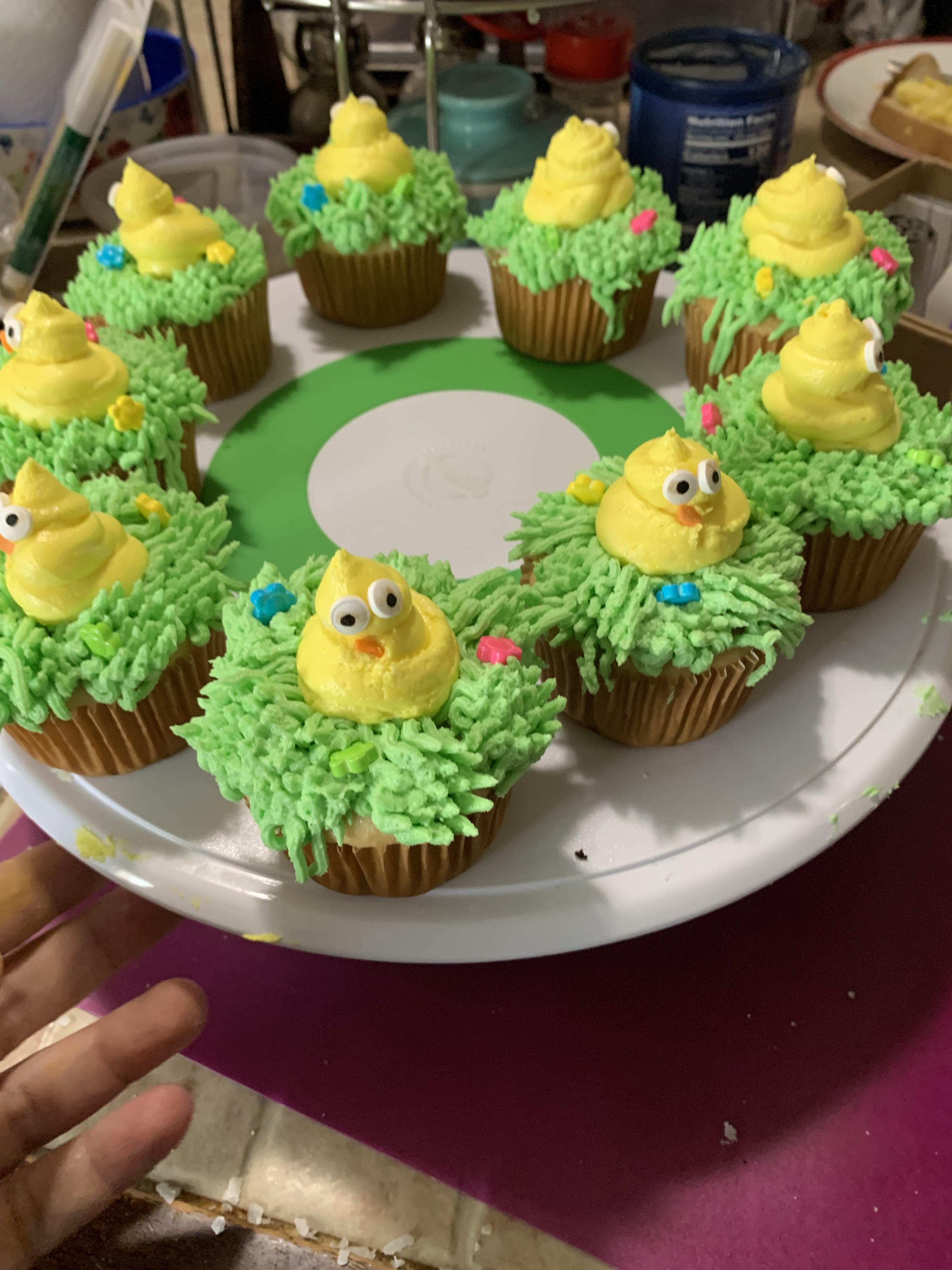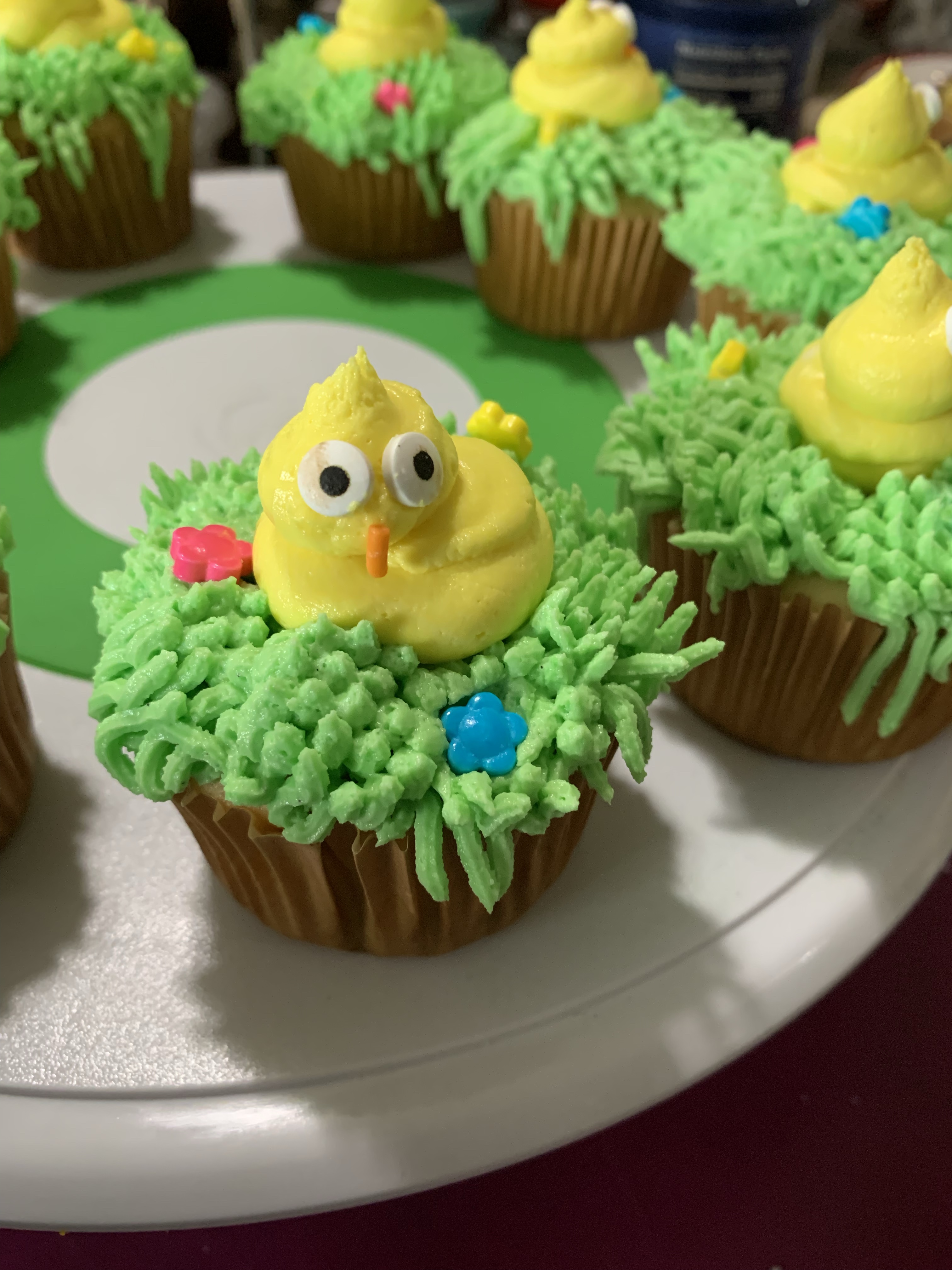The cupcakes were piped with a piping bag that had the end clipped off. Then we added some candy eyes and orange sprinkles (we found an unopened container from last Halloween) for the beaks because I really didn’t want to mix up any orange icing. We also added some flower sprinkles for a little extra touch.