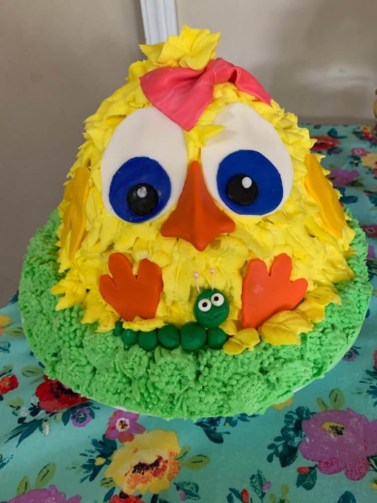 The yellow chick was made with a Barbie cake pan and a 12 inch cake layer underneath for her to sit on. The ‘feathers’ were piped with a large leaf tip (included in the Russian piping set). The ‘grass’ was a large tip from my Russian piping set that I haven’t used much.