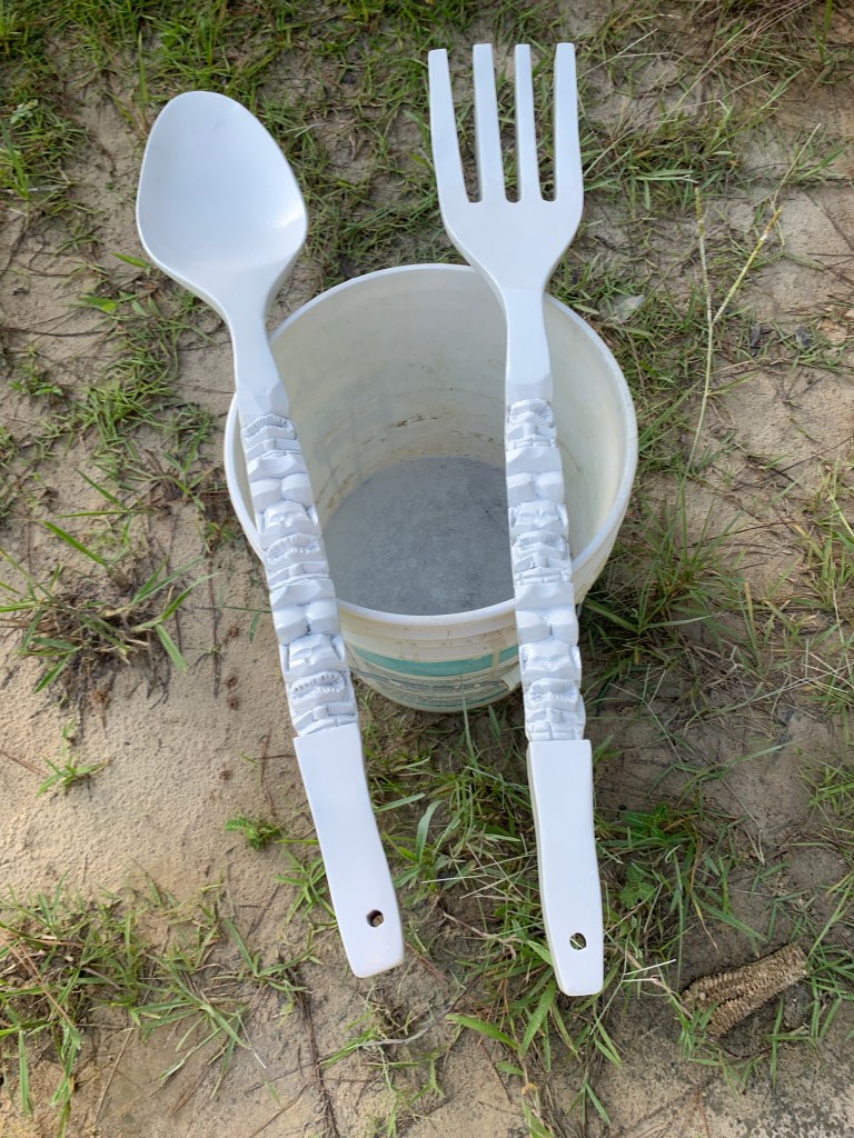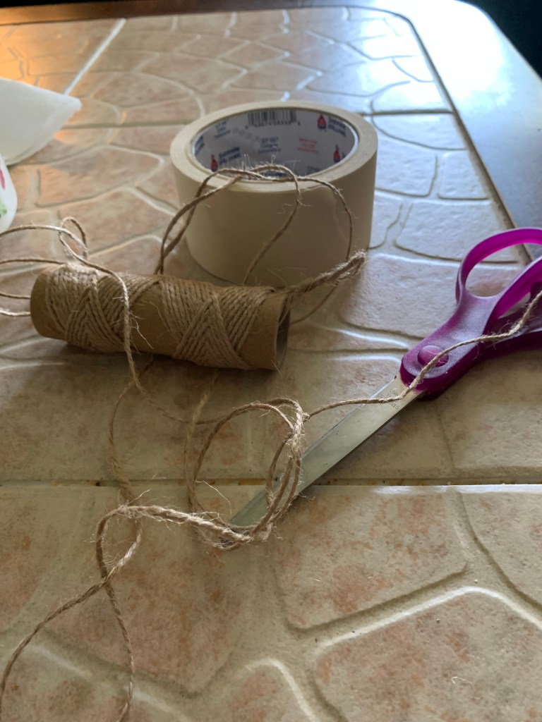 This next part was probably the most tedious as it felt like it took forever to wrap the twine around the handles. I wrapped some masking tape around the handles first to help ‘fill in’ some of the many dips in the handles on the ‘totem’ part.