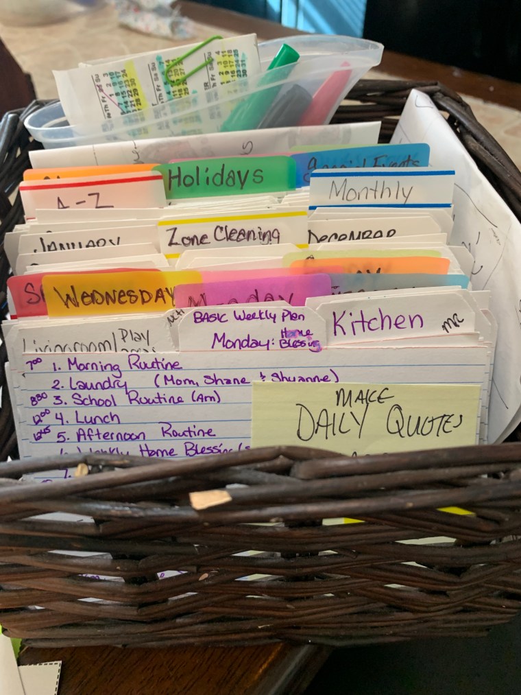 My index card system originally started out before I really used a computer much so it was the easiest way to keep our home organized at that time but it still works rather well. The kids knew what to do and when it needed to be done and I was able to tackle my household tasks while working 50-60 hours a week! These cards have been updated and modified as we’ve moved over the years but the basic principle still works the same.