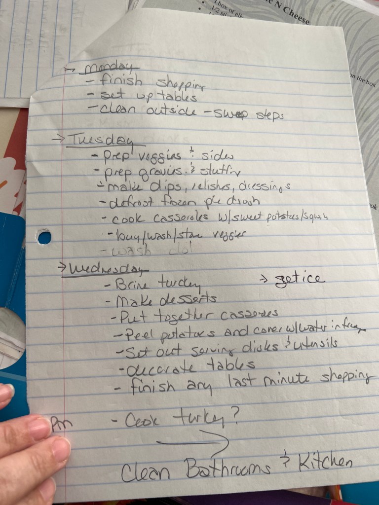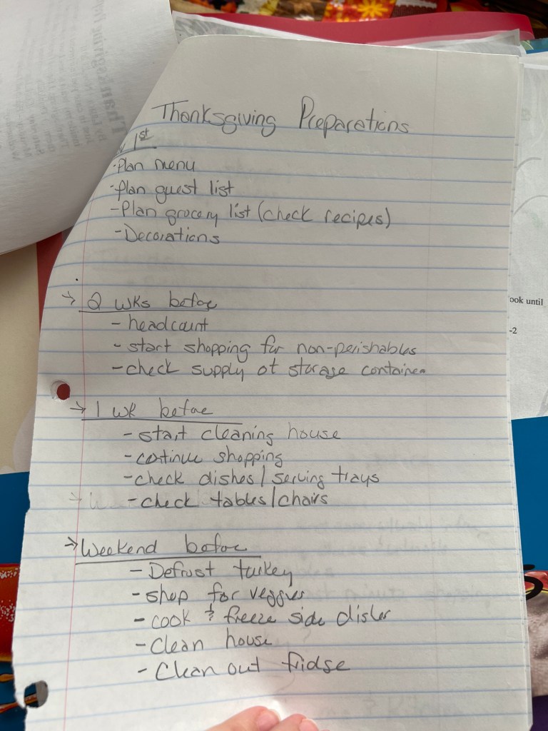 Behind the menus I have some notes that I wrote out many years ago to help me keep on track… please excuse the messy handwriting. This list is broken down into small steps and spread out to help keep me from feeling overwhelmed. I was using this lisr before I found the FlyLady Holiday Control Journal, and I still use it most often.