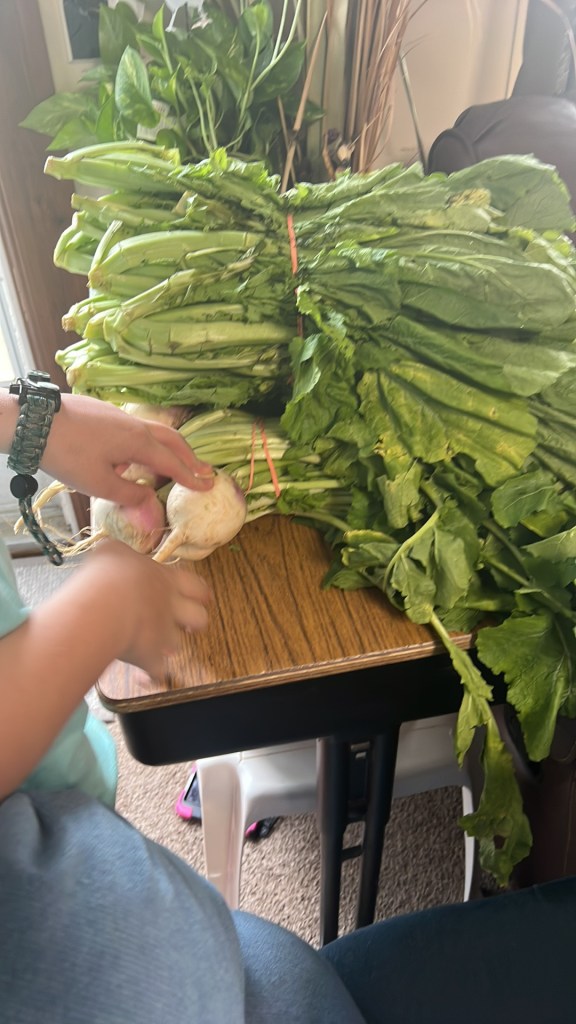 - Mashed potatoes with turnips… so good and you couldn’t even tell they were in there! This idea came from Christ-Centered Thanksgiving** and it has us thinking of other possibilities for using turnips!