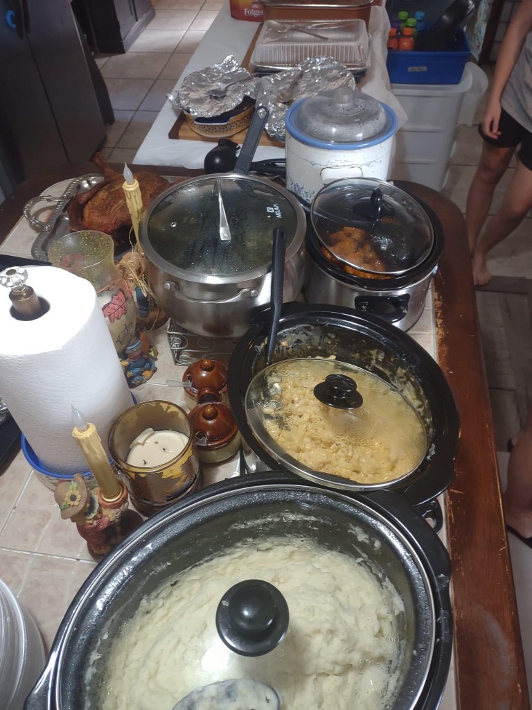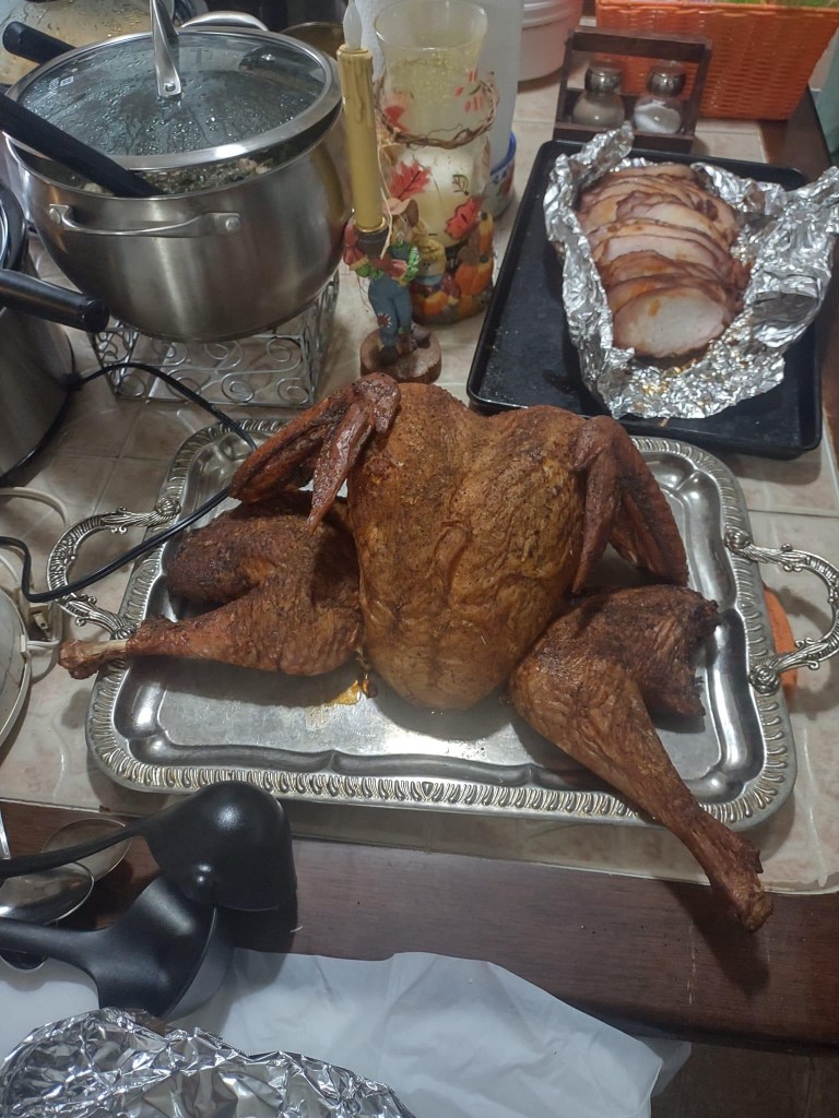 Things didn’t go quite as planned as our stove had a major malfunction and we weren’t sure that it was going to make it through Thanksgiving Day. The day before Thanksgiving I was baking away and the oven had a ‘runaway temperature’ malfunction and completely shut down. We cut the breaker off for a couple of hours and then when it came back on the oven liner caught on fire… thankfully we got that taken care of and it decided to work well enough to finish our preparations. Mr. Awesome ended up cooking the turkey on the smoker and he did an AMAZING job with it!
