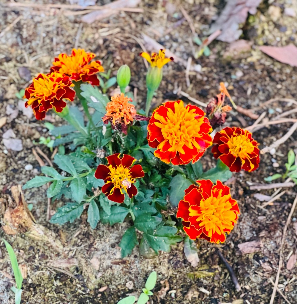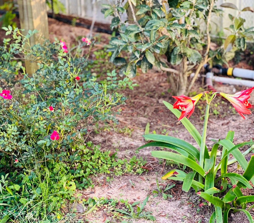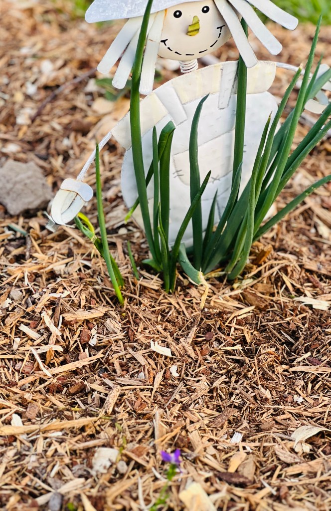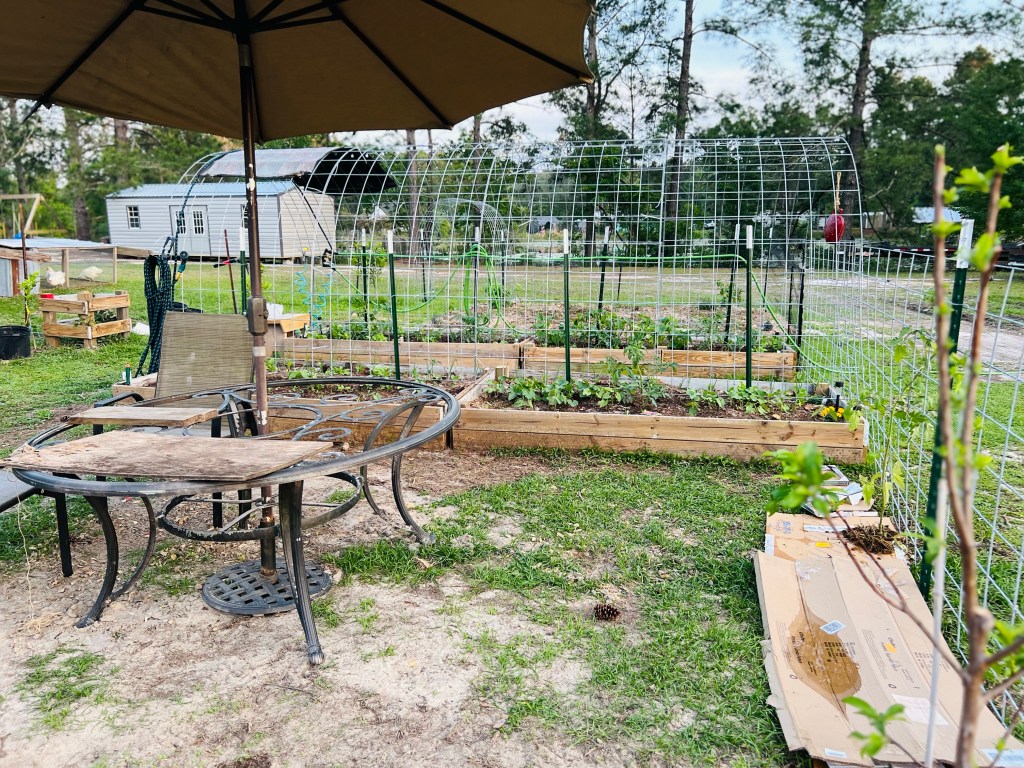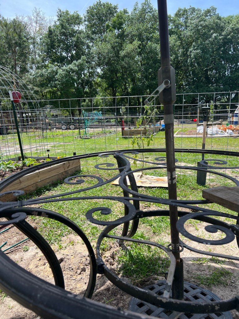 I had asked the kids to bring the old umbrella and stand… they brought me a table and chairs as well. This is now situated in Momma’s garden and I think they made a great decision bringing this to the garden. Now we just need to make a new top for it but I have been using a couple of scrap pieces of plywood to make a place to set plants and such… 🙂