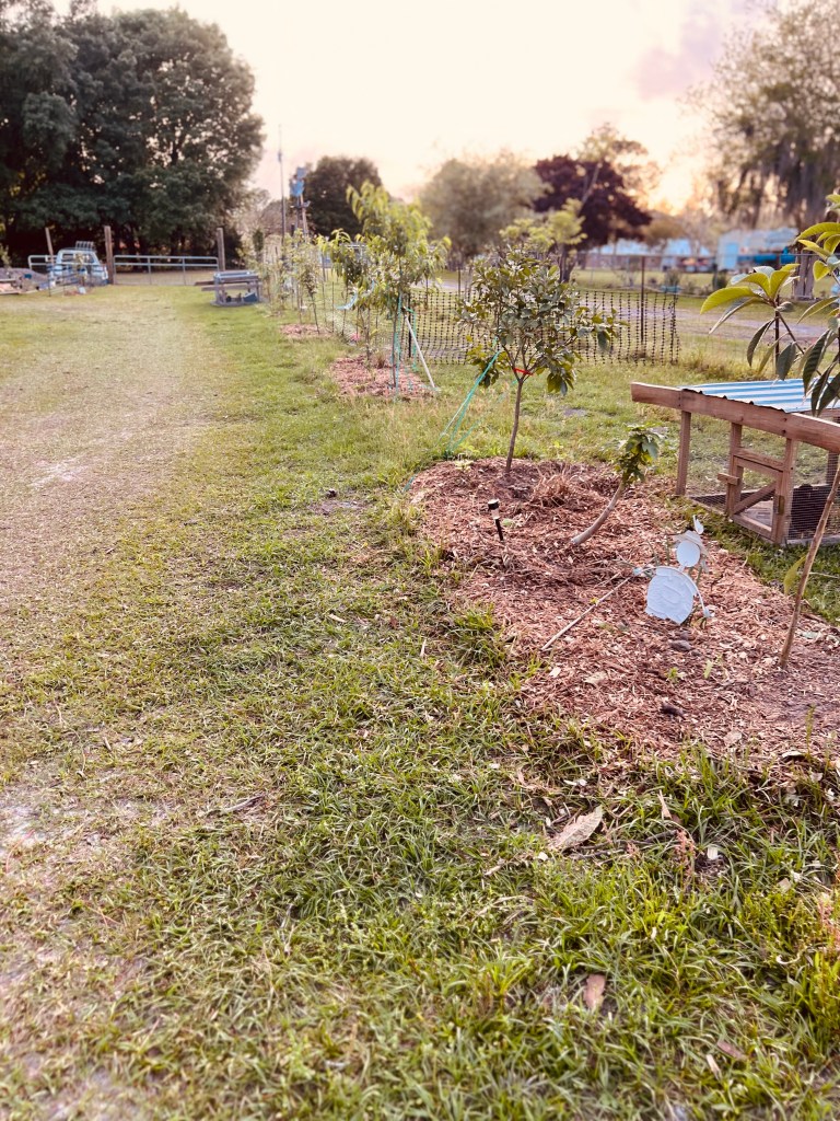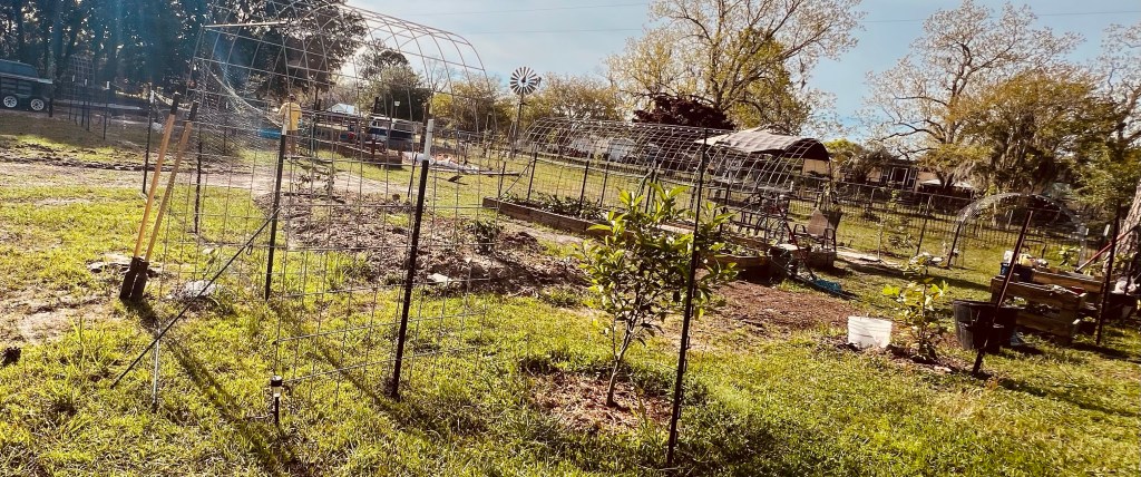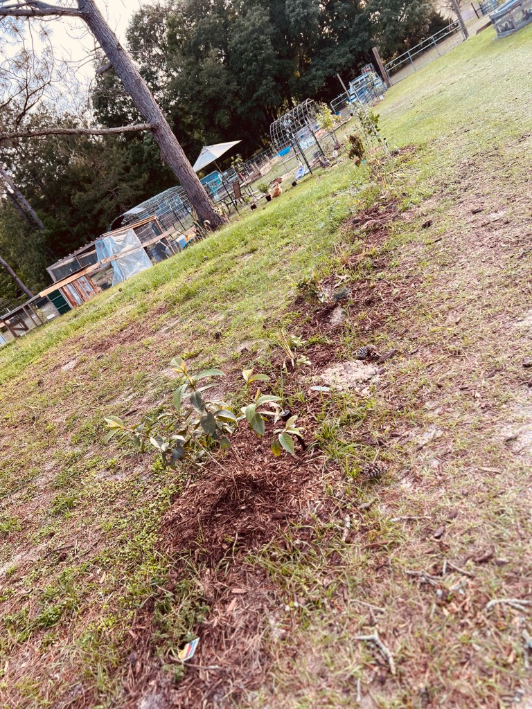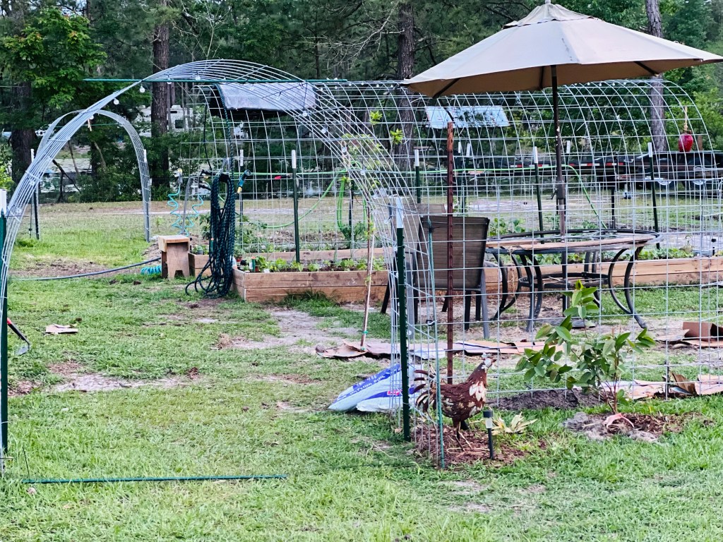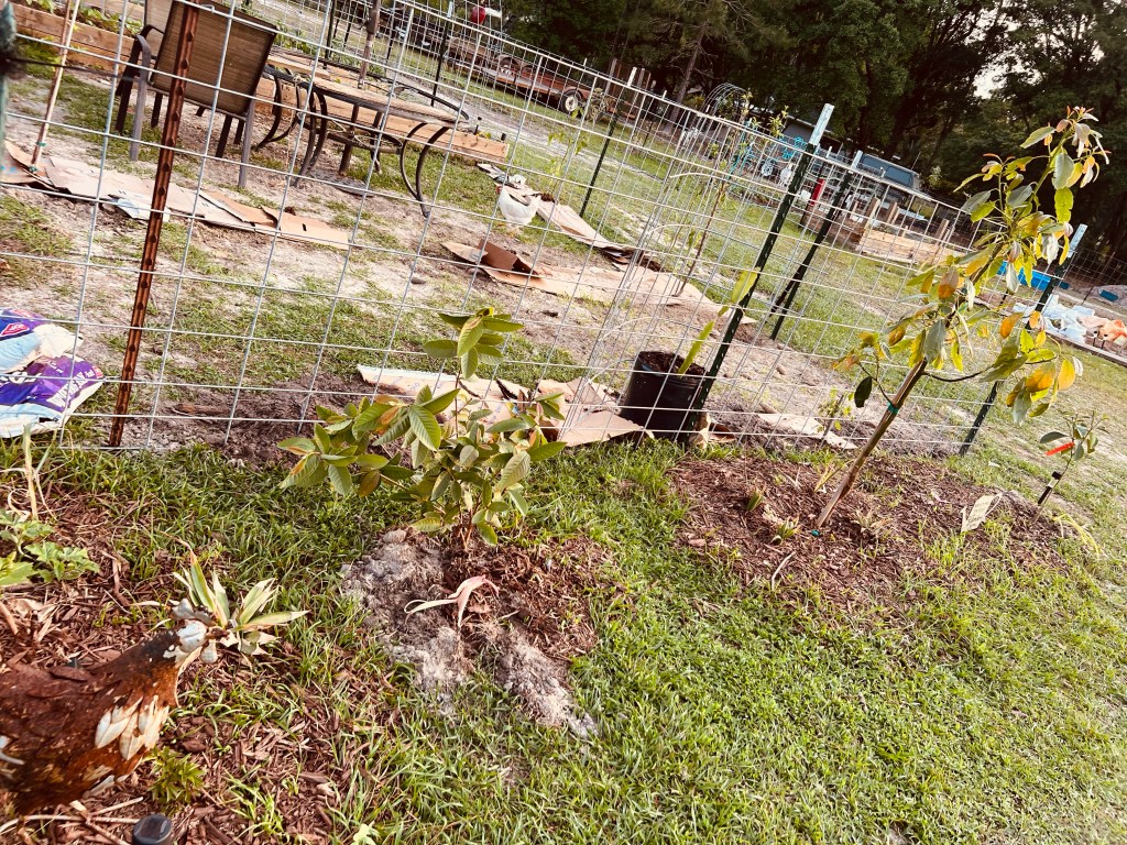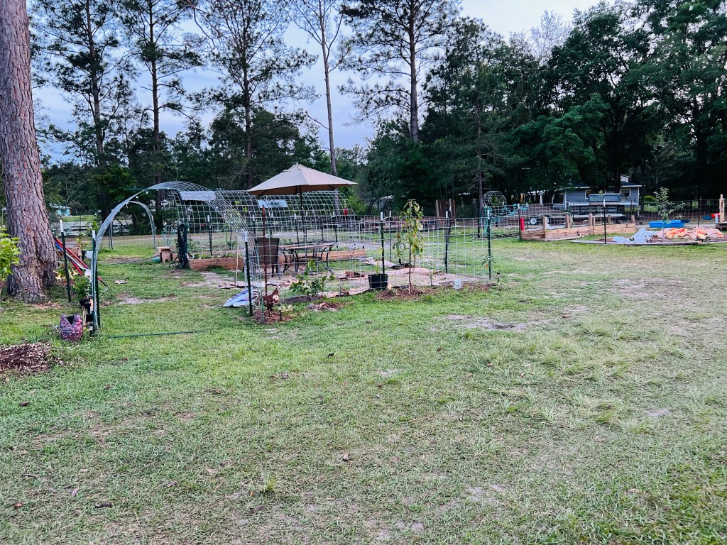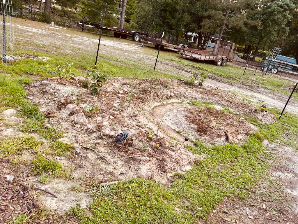 These are some pics of our newest garden area. We did manage to get some deer netting up to help keep the chickens out… some of them still manage to find their way in though so we just have to keep an eye open at all times. We don’t want a repeat of what they did a couple of months ago!