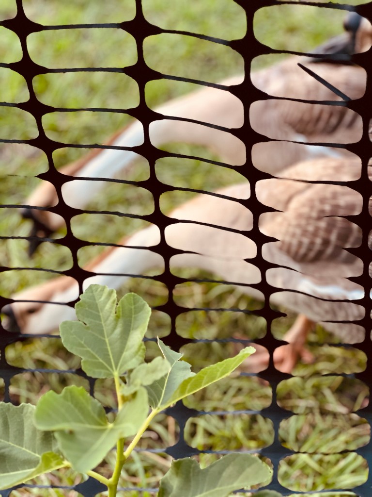 I had tried out some garden fencing to make a ‘run’ for the goats along the front fence but our crazy billy keeps tearing it down and spoiling it for everyone else because he starts pruning the fruit trees! The bigger geese have been happy to use it though!