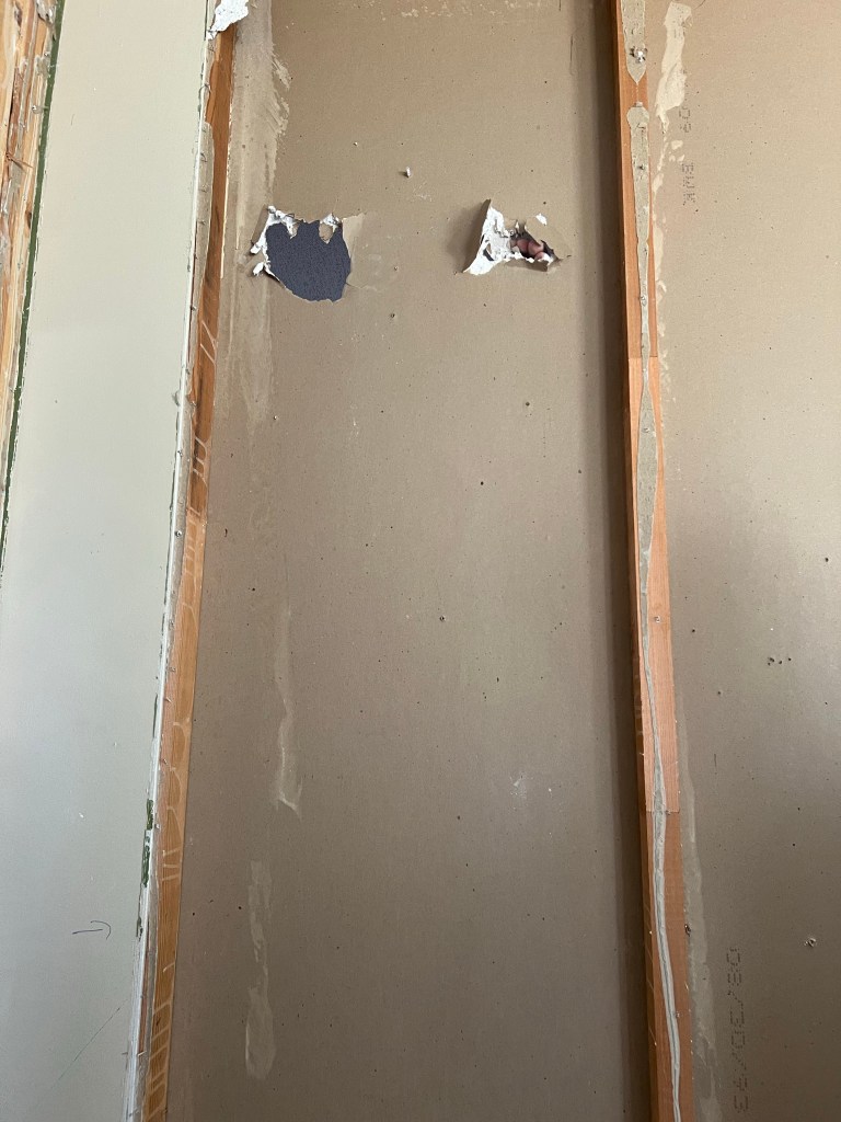 We moved the bedroom door over to the middle of the room which is now an extension of the previous hallway. This meant we also had to relocate a light switch but that wasn’t too much trouble. This change allowed the bunk beds to be placed on either side of the door and gave a nice big walkway/play space between the beds.