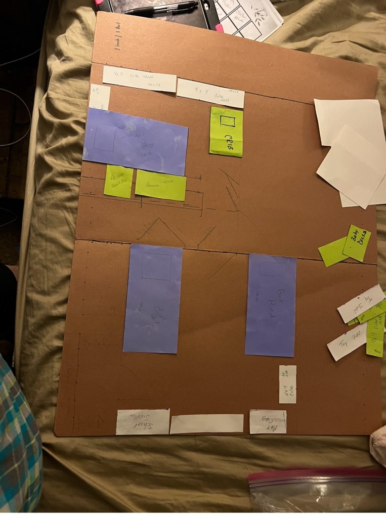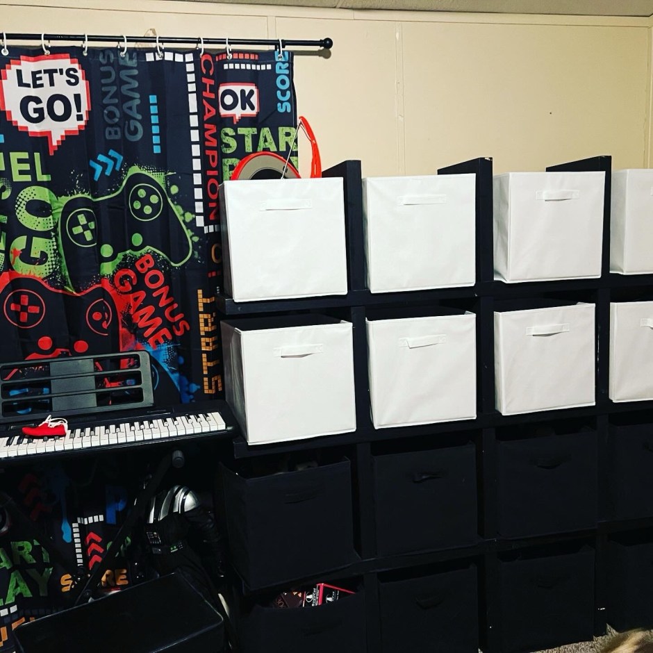 I brought in an old cubby shelf from another room and got some bins to fit so they could organize their toys and other things that they have like fishing boxes and such. This allowed room to keep the old armoire and the keyboard in the room. They also have a nice long path/play space at the foot of the beds.