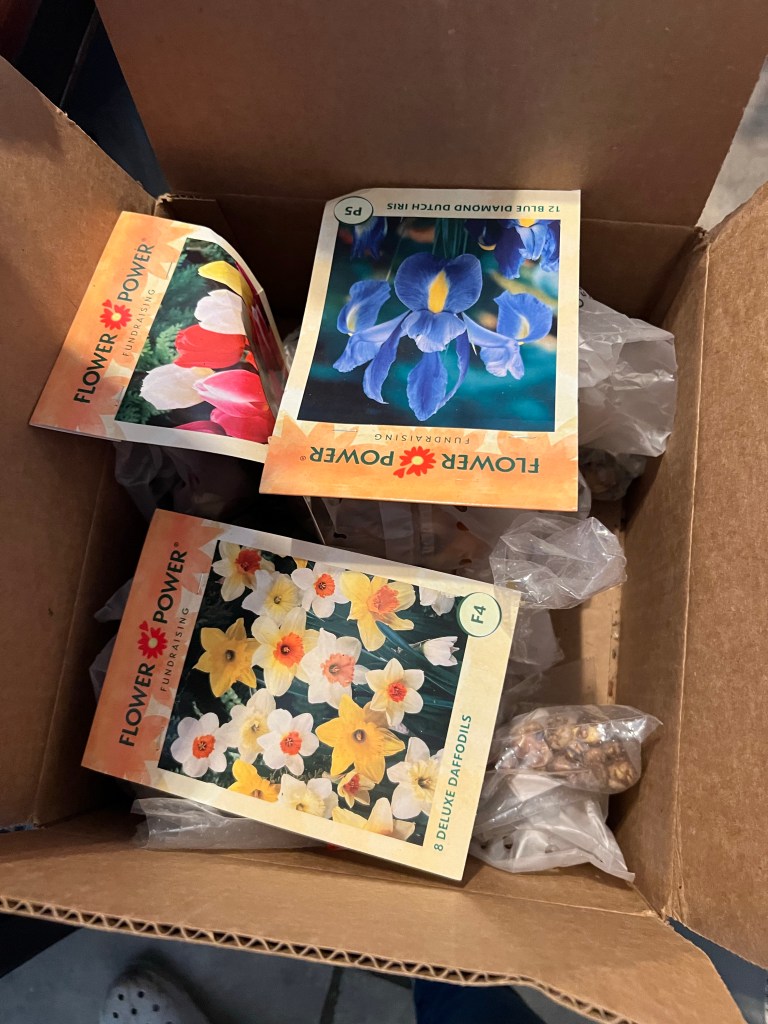 In November of last year, we had ordered some trees and flower bulbs to plant but the flowers were delayed, then lost, in all the Christmas hustle and bustle. The company was great and sent out some replacements but some of them had already been sold out. Well, we got the replacement package of bulbs and then the lost package arrived! Some of the older ones had already begun to sprout so we really needed to get them all out ASAP. (I did let the company know that we ended up with both packages.)