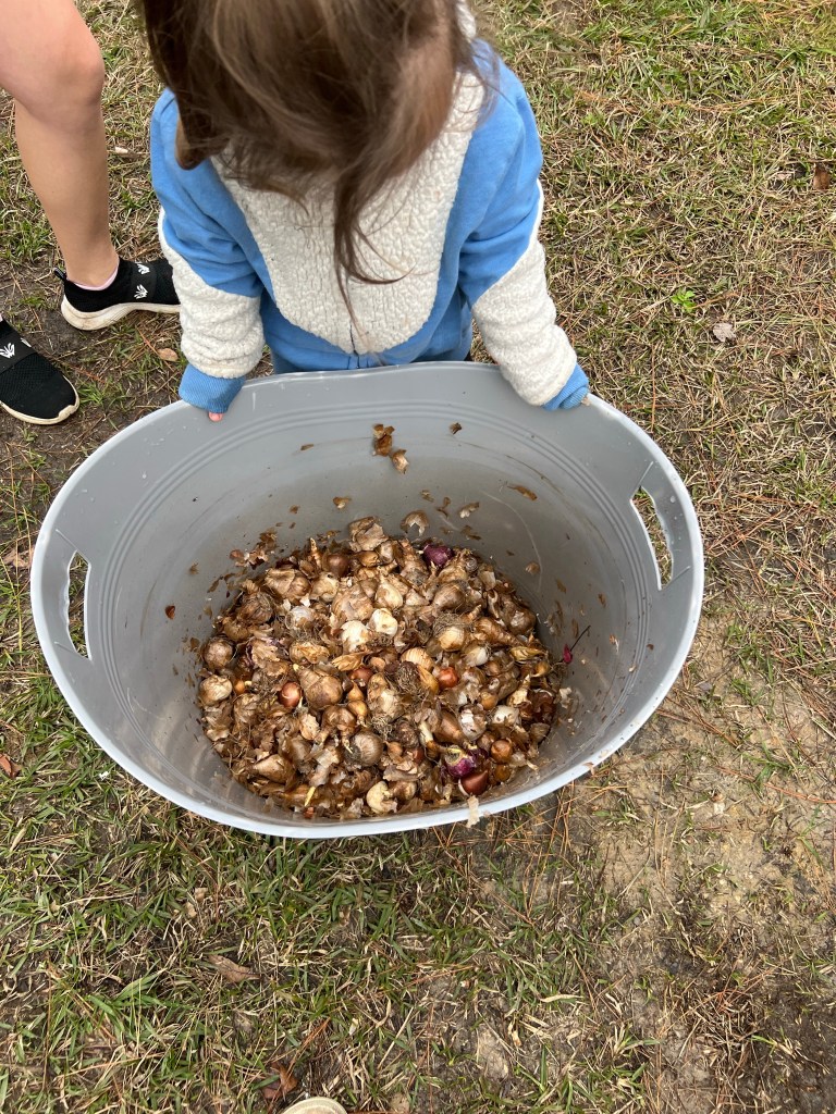 I had decision fatigue again and just decided to dump them all in a container and mix them up. We then walked around and planted them in random groupings around the house and garden… it’ll be so neat to see what pops up and where because the kids each got to take a few bulbs and put them wherever they chose.