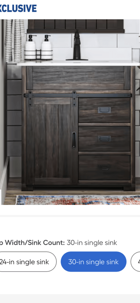 We had a small budget to start with and it was rapidly dwindling but we did find a couple of vanities… my brain was not in the mood for shopping so I’m starting to second-guess the choices now but we will use what we have so that we can at least get the toilet and sink functioning again to make things a little easier around here.