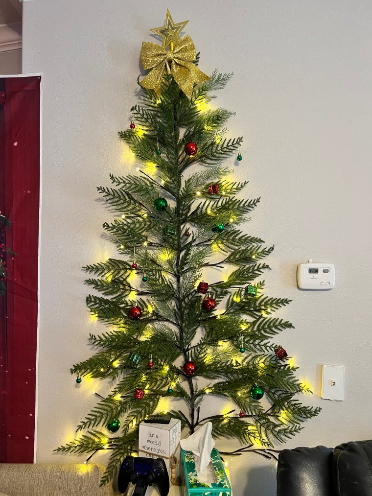 After breakfast, we put up a small tree… it goes on the wall and was very scraggly, but I was able to ‘pretty it up’ with some leftover craft supplies from last year. It really is a beautiful little tree and it fits perfectly in the space we had!