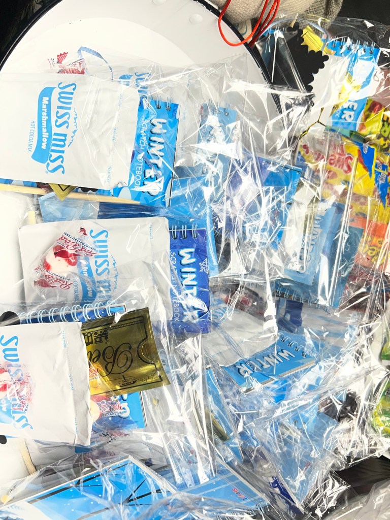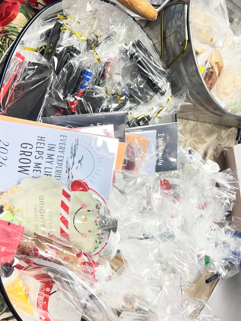 No one went home empty-handed, as we had a ton of party favors for everyone. The kids had some fun little scratch-off books, hot cocoa packets, a special Christmas cup, and a few candies, as well as some toys from our treasure box stash and other goodies. The grown-ups got to choose between face masks/lotions and pocket-sized tools, as well as pocket calendars for everyone! We also had lots of yummy treats and breads for everyone to take home.