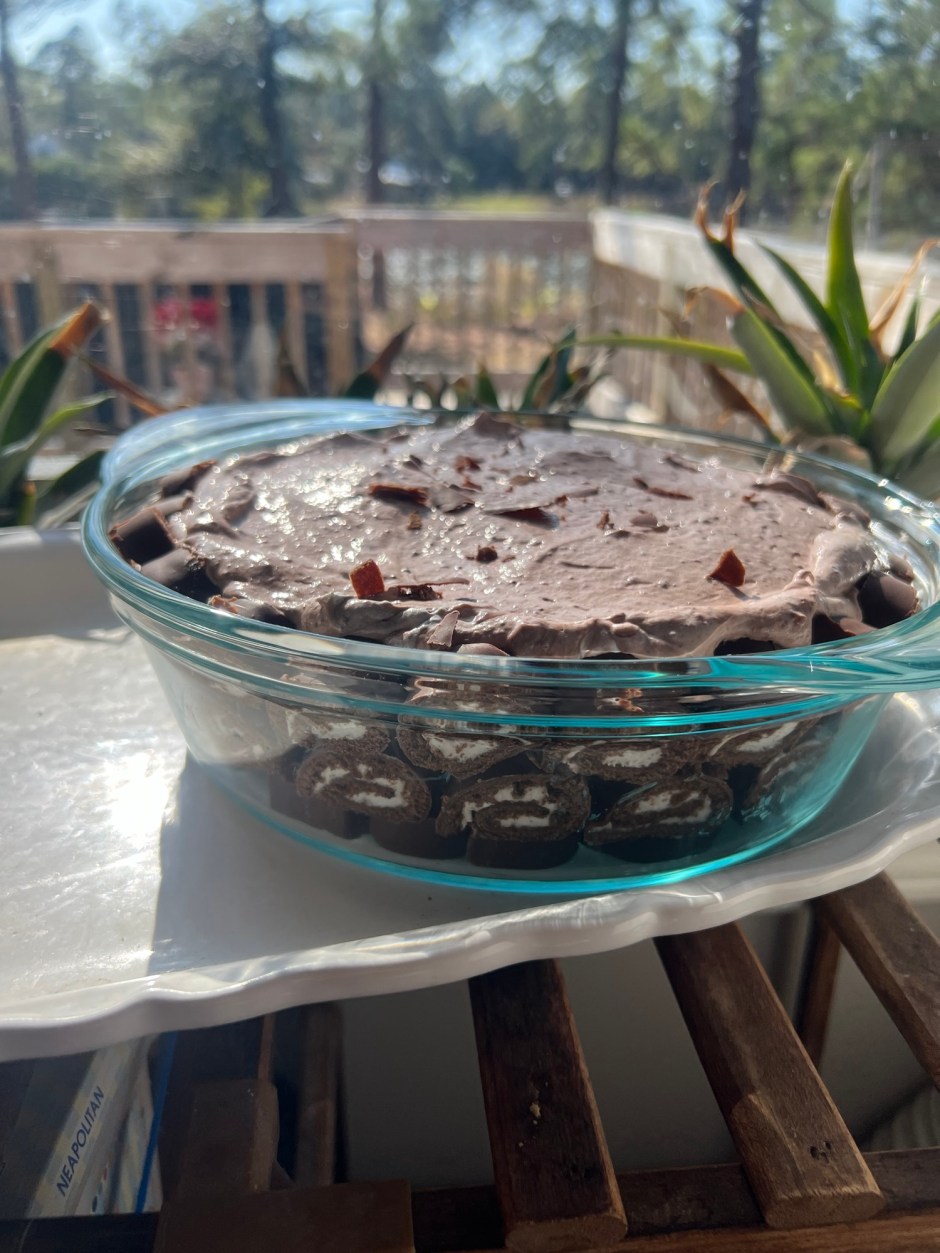 Slice the cake rolls into 4-5 slices per roll. Line the bottom and sides of a container with the slices.