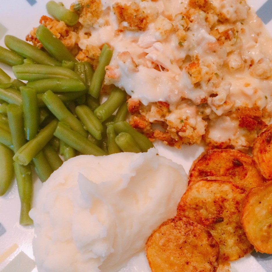 Crunchy Chicken, Mashed Potatoes, Cheesy Squash Casserole