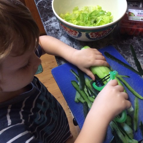 That afternoon Jacob put his Kids Cook Real Food skills to work while helping me make a salad to go with our Red & White Pasta.