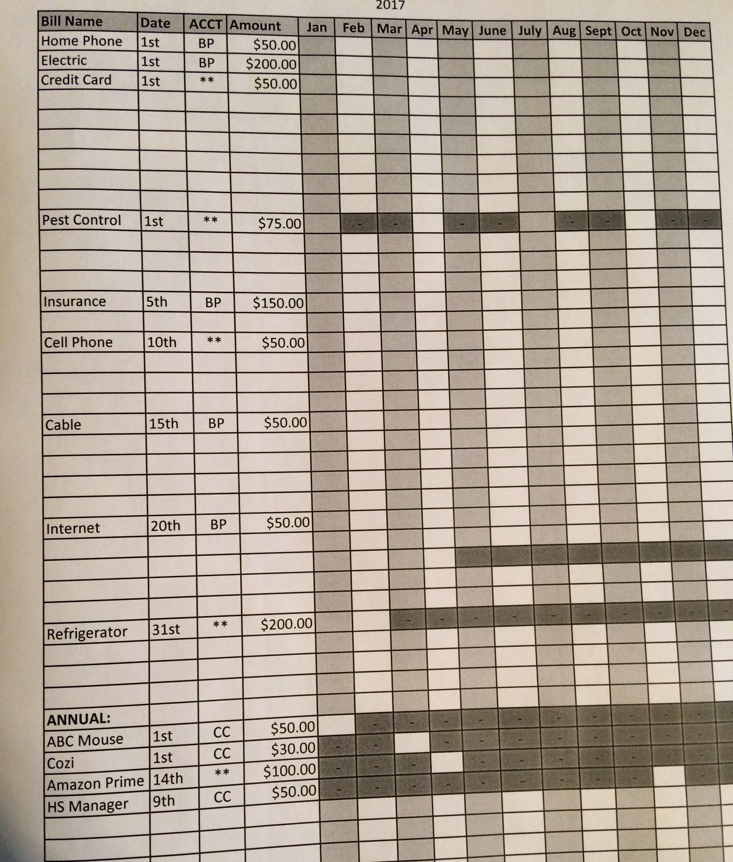 This next picture is of the bills that are paid on a monthly basis.They are listed in order by the due date. I try to pay the biggest majority of my bills around the beginning of the month. This method may not work for you or your family. Make sure you know when the bills are due and pay them according to your pay schedule. After the bill has been paid for the month I simply put a ✓ in the box under the month.
