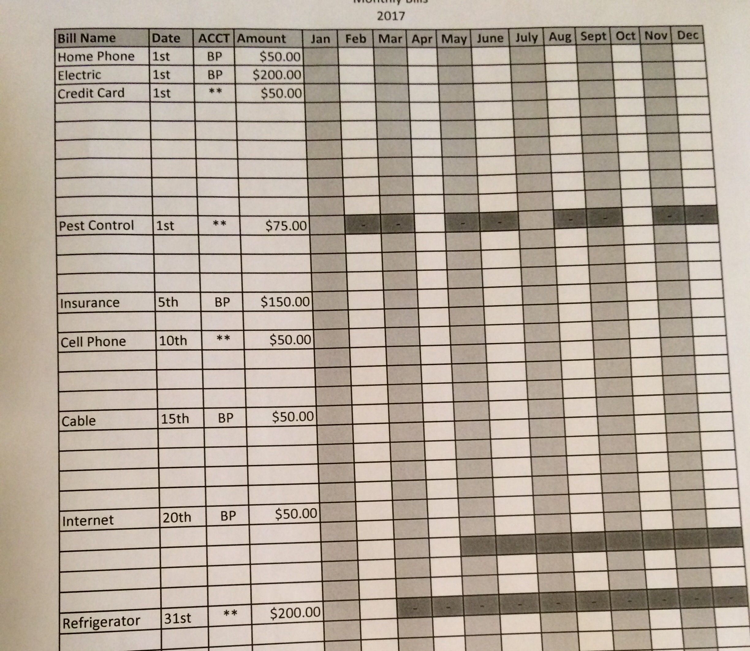 For the bills that only happen every other month, or like the pest control which is every three months, I simply shaded out the other months. For the refrigerator I only have a couple of more payments, yay, so I shaded out the rest of the months.